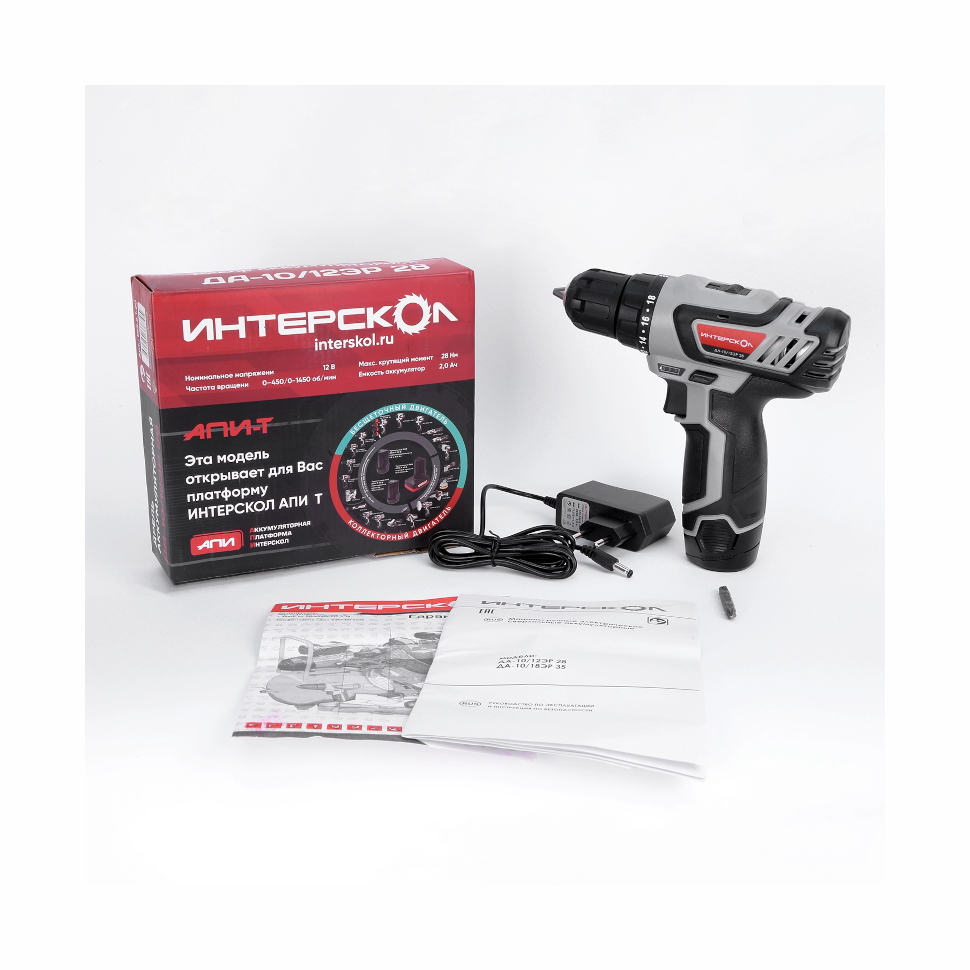 Шуруповерт Интерскол ДА-10/12ЭР 28 Li-ion (595.2.1.20). Аккумуляторная батарея АПИ Т 12 В емкостью 2 А/ч - 2шт. Часовое моноблочное зарядное устройство. Руководство по эксплуатации. Инструкция по безопасности. Гарантийный талон. Экокейс. |