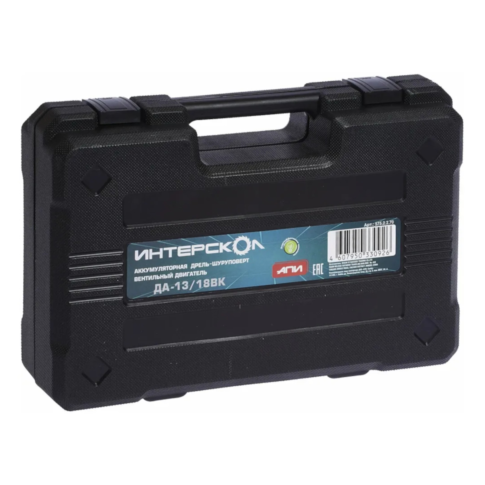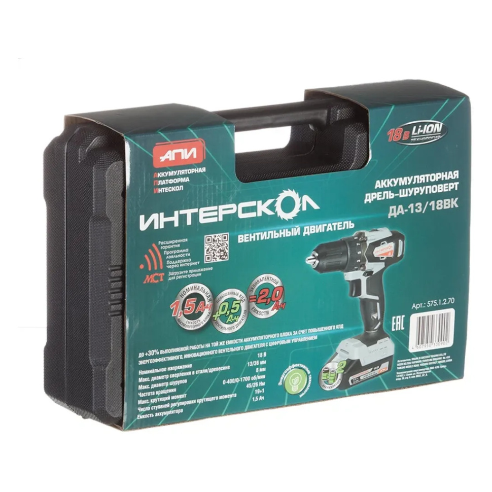 Характеристики Шуруповерт Интерскол ДА-13/18ВК Li-ion АПИ (575.1.2.70) (бесщ., 2АКБx1.5А/ч + ЗУ, кейс)