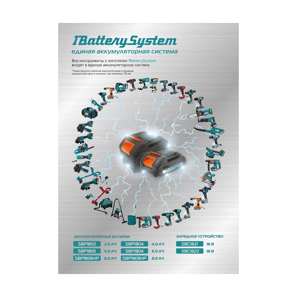 1. Единая аккумуляторная система (1BatterySystem) - универсальная платформа, совместимая со всей линейкой аккумуляторного инструмента Sturm. Сменные батареи будут доступны в продаже в течение 15 лет. Индикатор заряда на аккумуляторе позволяет проверить уровень заряда без подключения к инструменту.