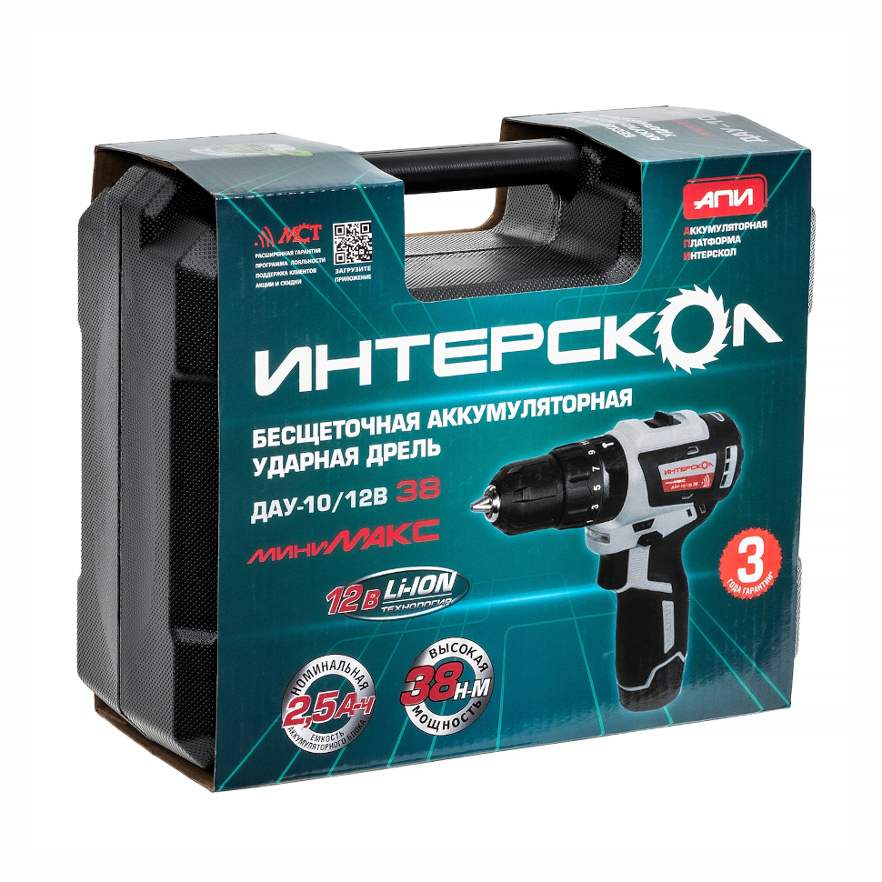 Характеристики Шуруповерт ударный Интерскол ДАУ-10/12В 38 МиниМАКС Li-ion (АКБ 2*2.5Ач и ЗУ, кейс) 767.2.2.45