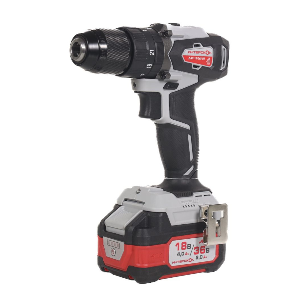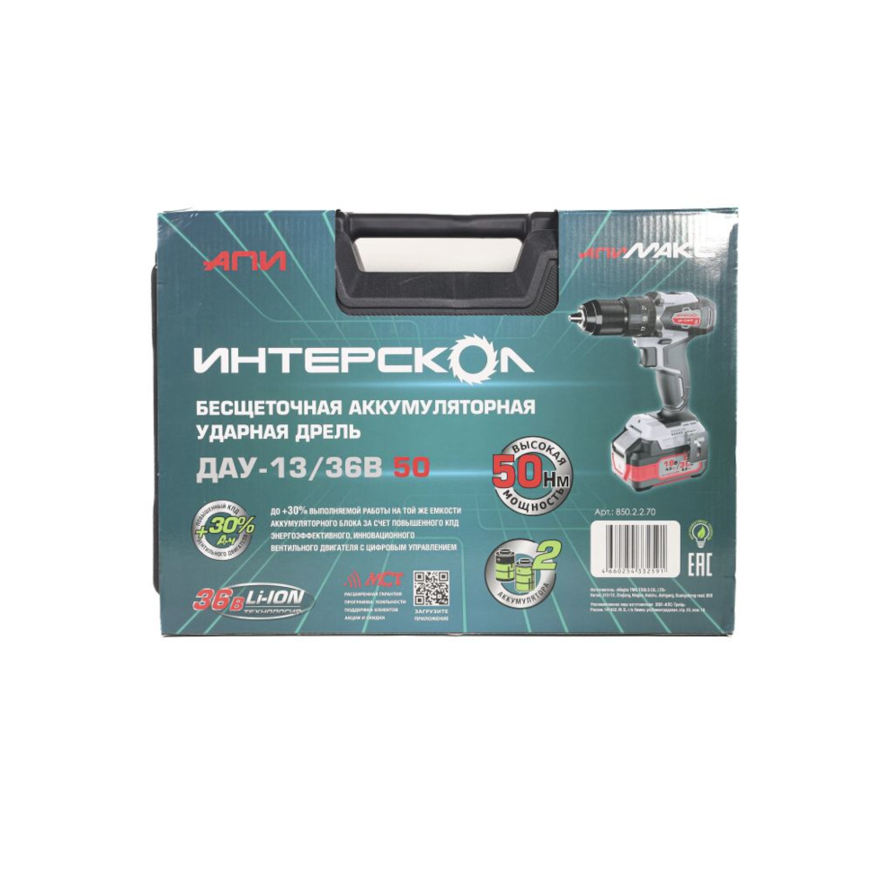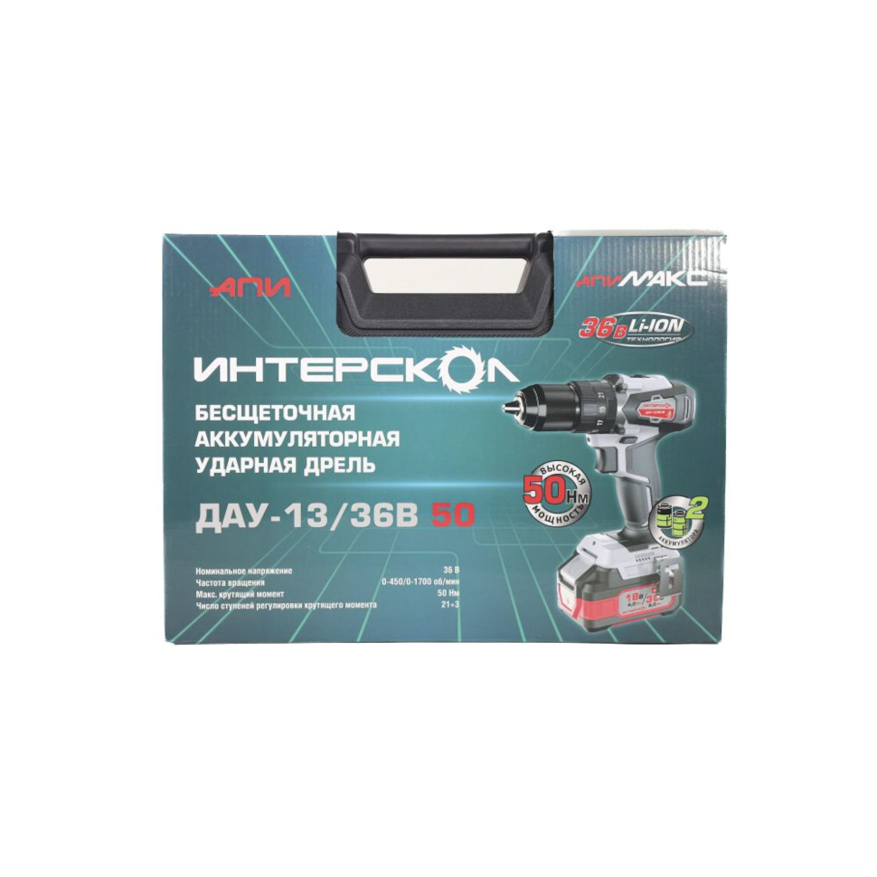 Характеристики Шуруповерт ударный Интерскол ДАУ-13/36В 50 Li-ion АПИ (36В, бесщ., кейс, 2x2Ач, ЗУ) 850.2.2.70