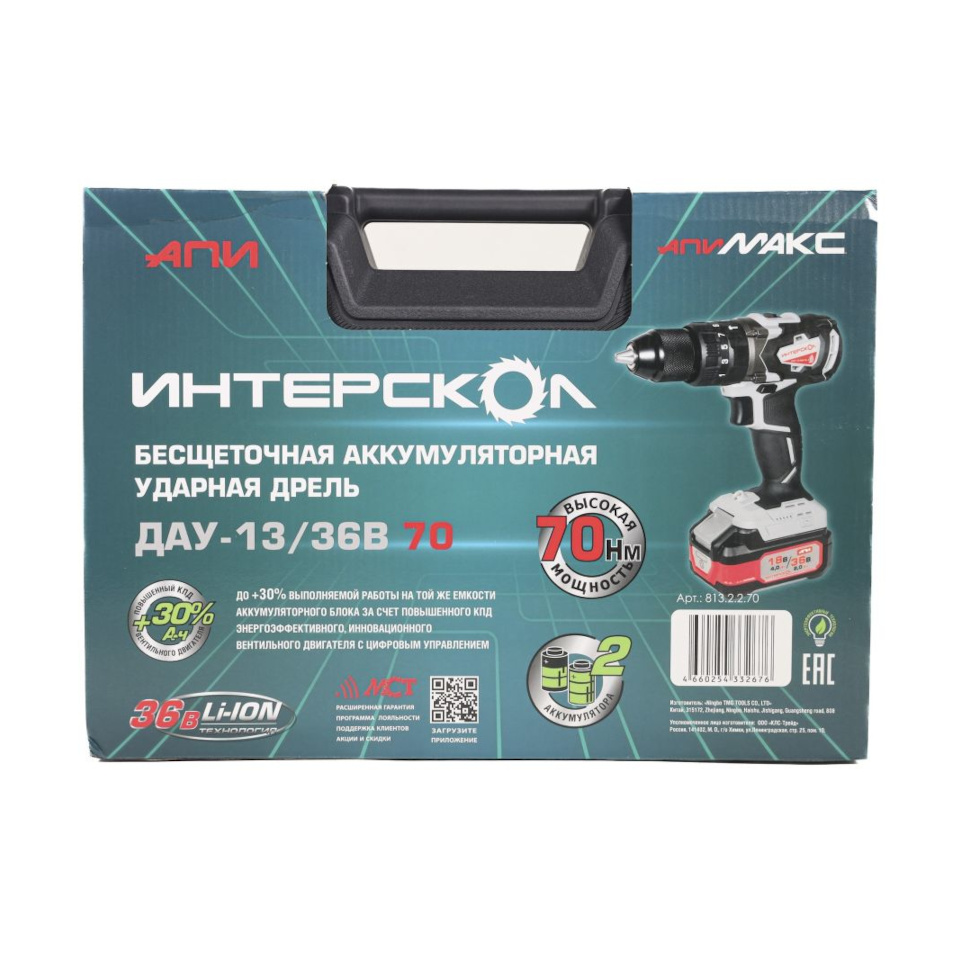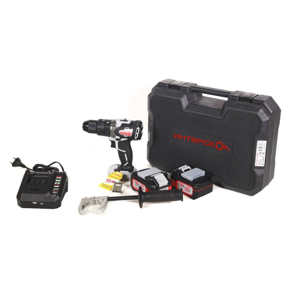 Преимущества Интерскол ДАУ-13/36В 70 АПИ (813.2.2.70):Обратите внимание: модель поставляется с 2 аккумуляторными батареями 2 А/ч (АКБ) и зарядным устройством (ЗУ).