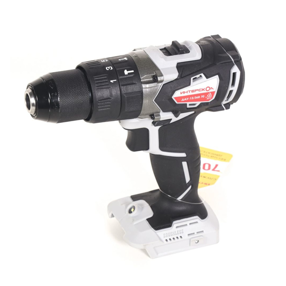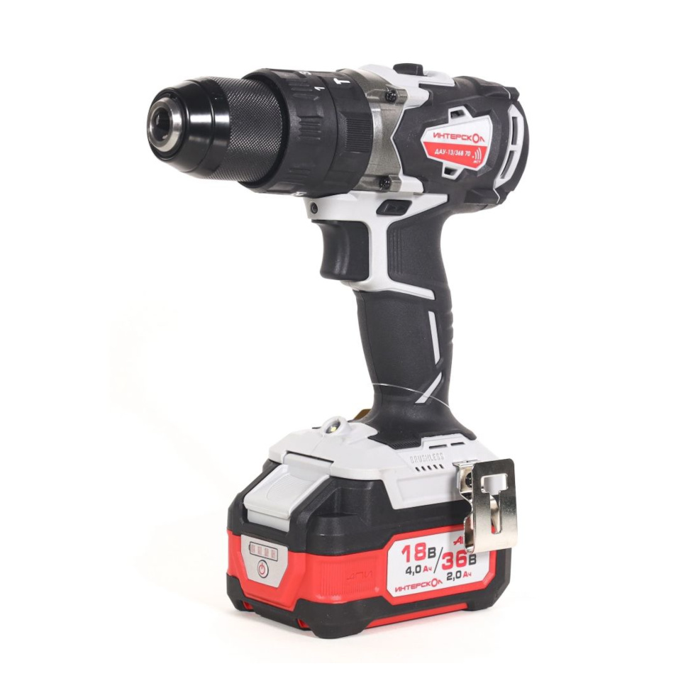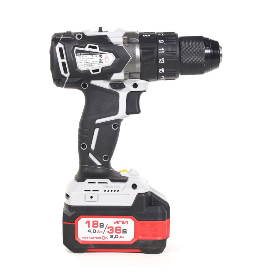 Профессиональная бесщеточная дрель-шуруповерт Интерскол ДАУ-13/36В 70 обладает высокой мощностью и крутящим моментом - максимальный крутящий момент 70 Нм и частота ударов 30000 уд/мин обеспечивают высокую производительность при сверлении твердых материалов и закручивании крупного крепежа.