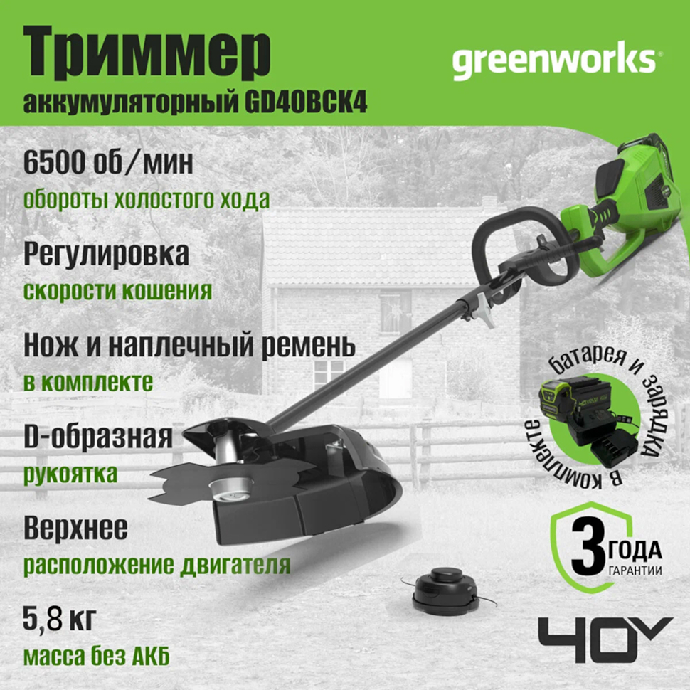 Преимущества Greenworks GD40BCK4 (1301507UB):Аккумуляторный триммер Greenworks - идеальный выбор для владельцев загородных участков, кто ценит чистоту, тишину, удобство и заботу об окружающей среде. Он обеспечивает свободу от проводов и выхлопов без компромиссов в мощности.