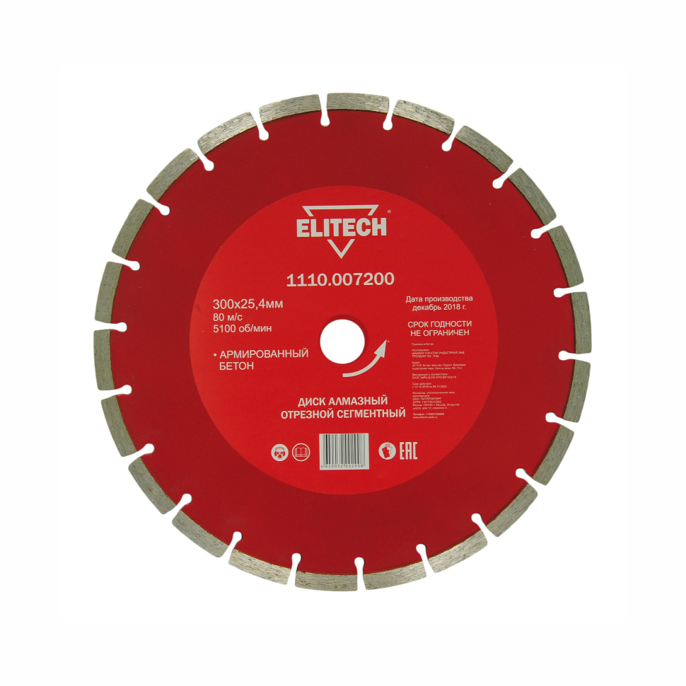 Характеристики Диск алмазный 300x25.4 (армированный бетон) Elitech (1110.007200)