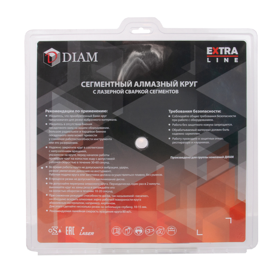 Профессиональный алмазный отрезной сегментный диск Diam диаметром 350 мм из серии «Асфальт» (артикул 000619) демонстрирует высокую надежность благодаря технологии лазерной сварки сегментов, обеспечивающей прочное соединение алмазосодержащих сегментов с корпусом диска.