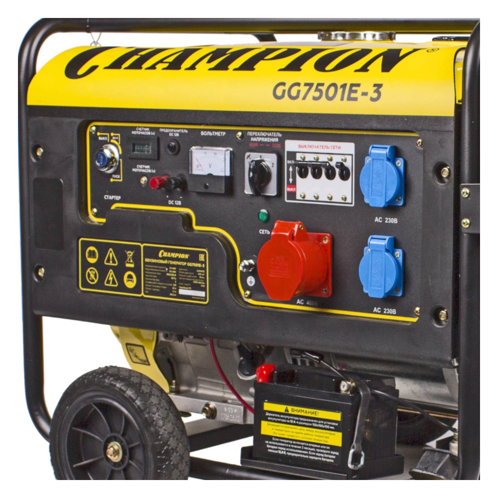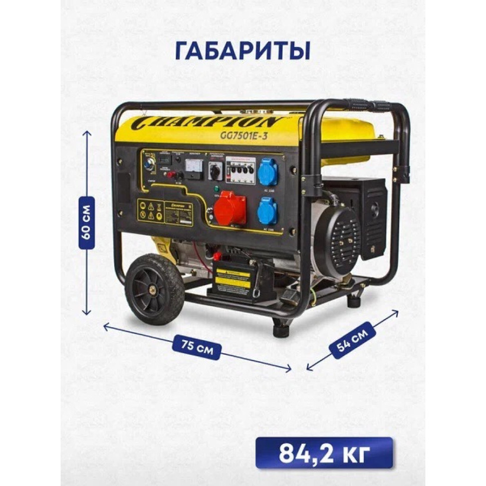Бензиновый генератор Чемпион GG7501E-3 отличается высокой производительностью, рассчитан на интенсивную эксплуатацию, и выходное напряжение 220/380 В, что расширяет спектр его применения.