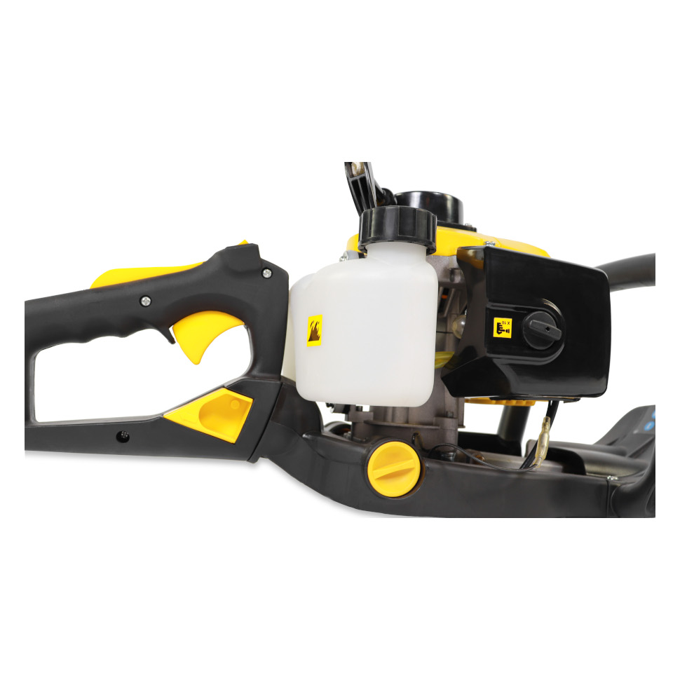 - Бензиновый двигатель не требует подключения к электросети, что позволяет работать в любом месте участка независимо от погоды и наличия розеток.
