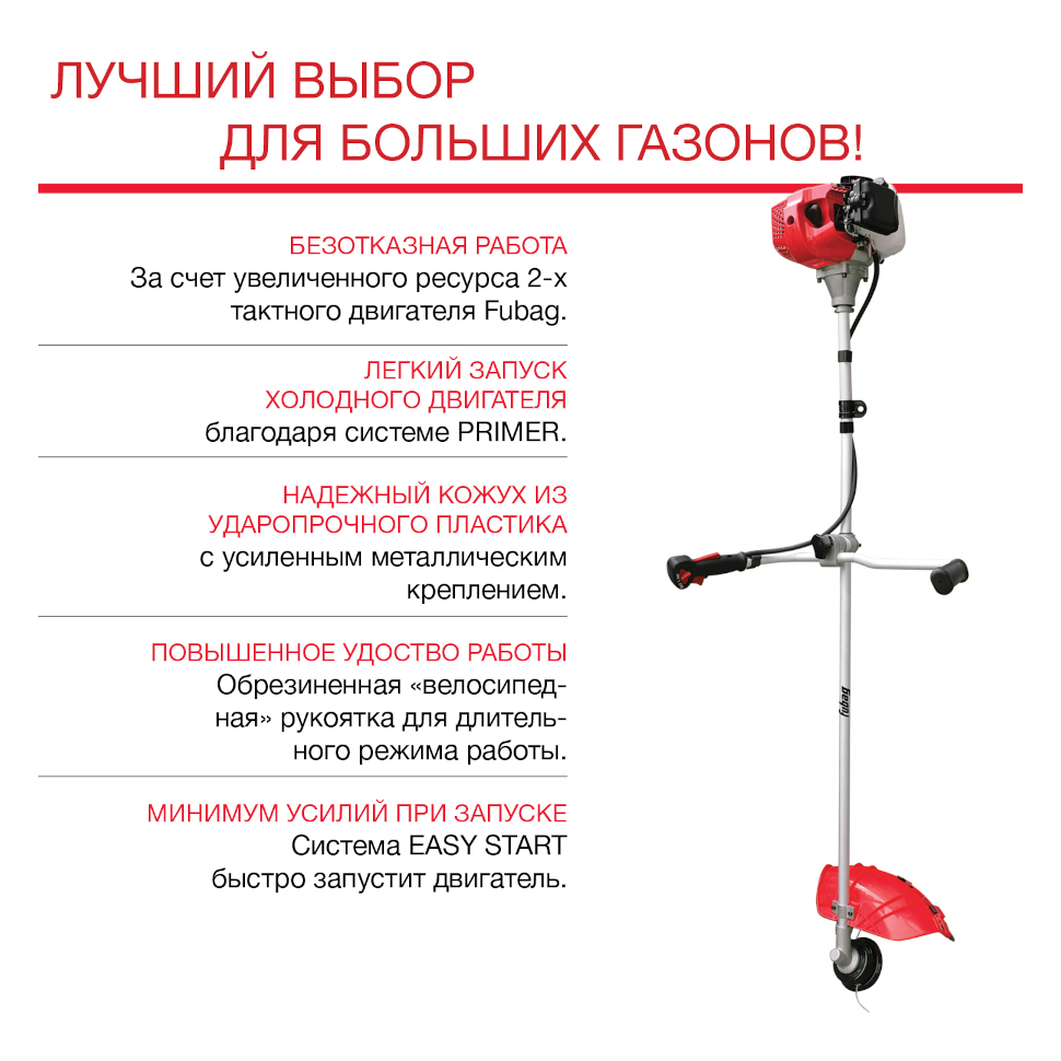 Бензиновый триммер (бензокоса) Фубаг FPT 52 с ножом и ранцем обеспечивает эффективное кошение - легко справляется с густыми зарослями и сорняками благодаря мощному бензиновому двигателю.