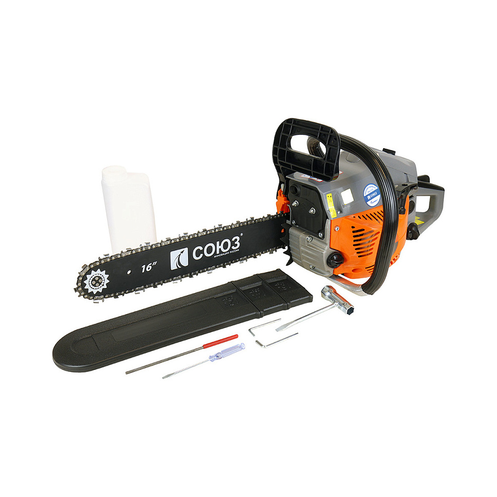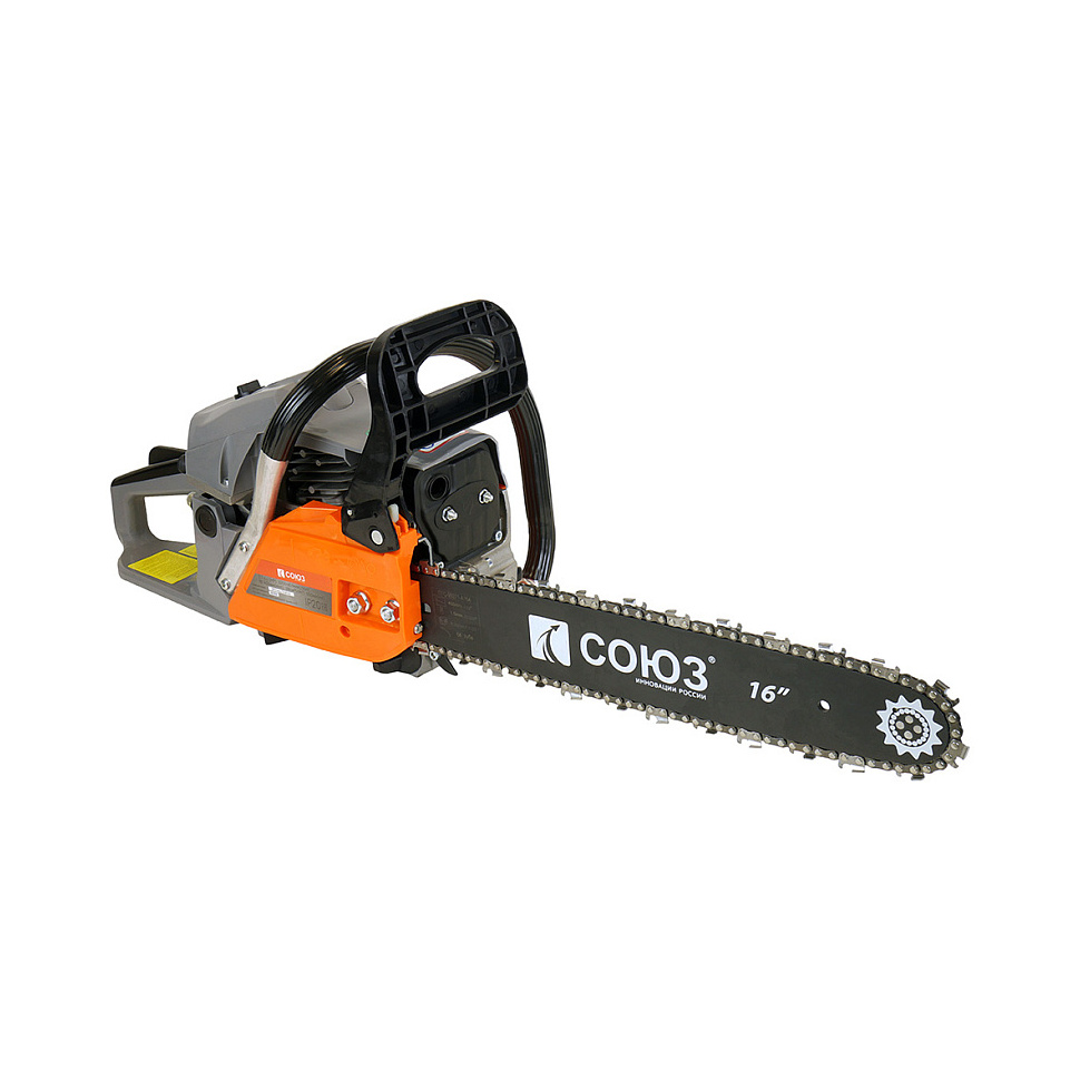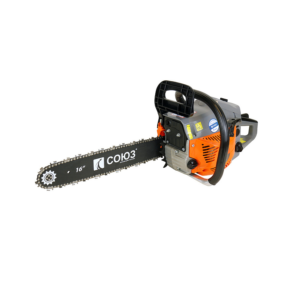 Бензиновая цепная пила Союз ПТС-99371 оснащается экономичным двухтактным двигателем объёмом 38 см3 и мощностью 2 кВт (2.7 л.с.).