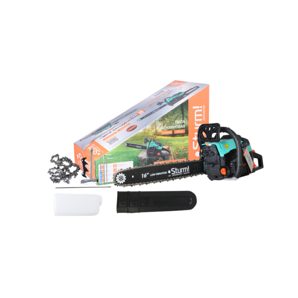 Бензопила Sturm GC99452B. Пильная цепь. Пильная шина. Пластиковый защитный кожух шины. Отвертка. Круглый напильник для заточки цепи. Мерный стакан для приготовления топливной смеси. Комбинированный ключ. Шестигранные ключи (2 шт.: 3 мм, 4 мм). Зубчатый упор. Инструкция по эксплуатации. Инструкция по безопасности. Коробка. |