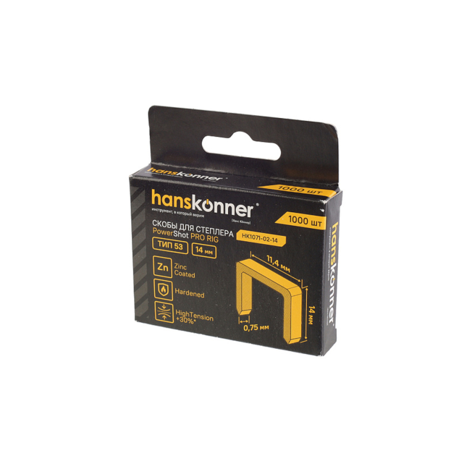 Скобы для степлера 14 мм, тип 53, 1000 шт/уп Hanskonner (HK1071-02-14). Коробка. |