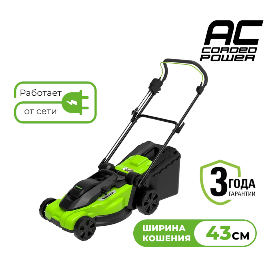 - Косилка работает тихо, без вредных выхлопов, что делает стрижку газона комфортной для вас, ваших соседей и окружающей среды.