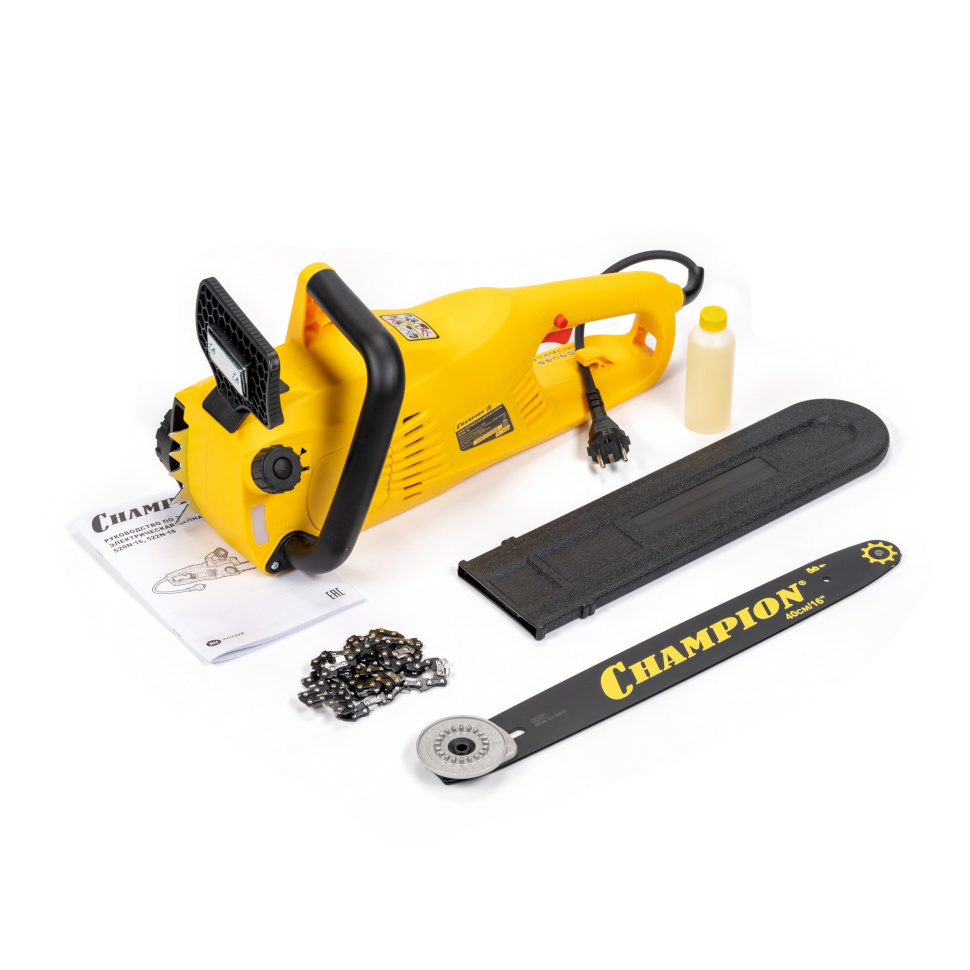 Пила цепная электрическая Champion 520N-16. Шина. Цепь. Чехол защитный шины. Масло для смазки шины и цепи 0,1 л. Руководство по эксплуатации. Коробка. |