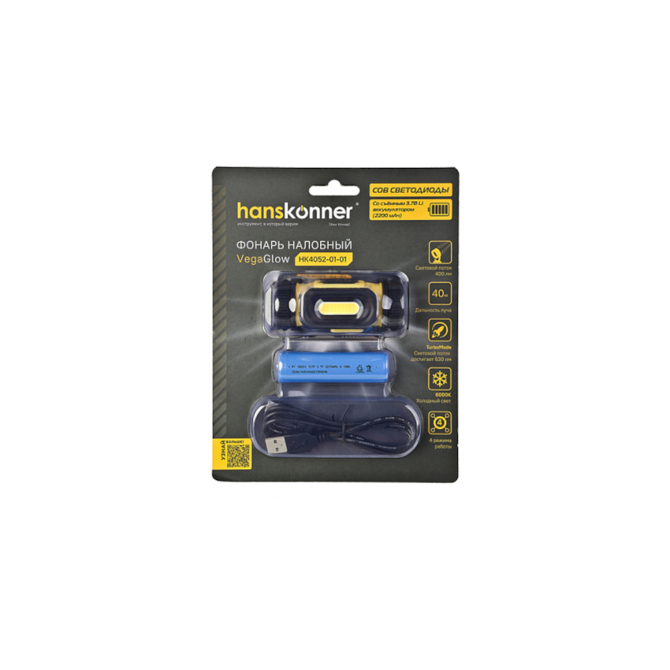 Фонарь налобный 400лм (турбо 630лм), 4 режима, 2200 мАч HANSKONNER (HK4052-01-01). Блистер. |