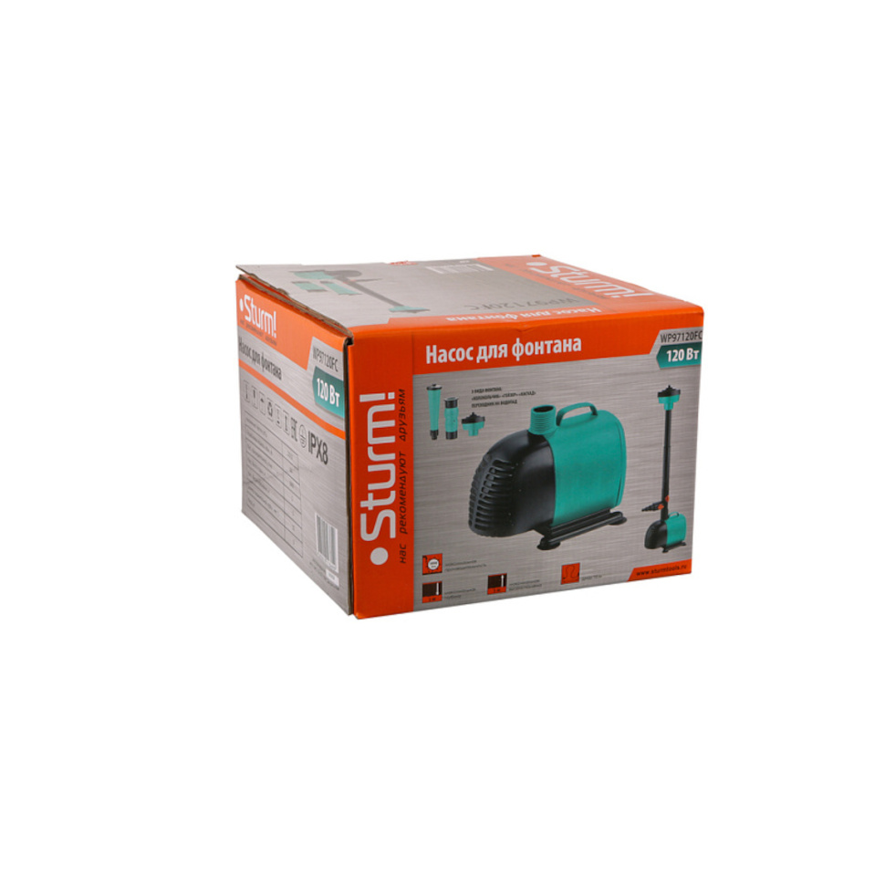 Насос фонтанный Sturm WP97120FC. Трубка-удлинитель. Насадка сменная (3шт). Переходник для водопада. Выходной штуцер. Переходная гайка. Основание с присосками. Инструкция по эксплуатации. Инструкция по безопасности. Коробка. |