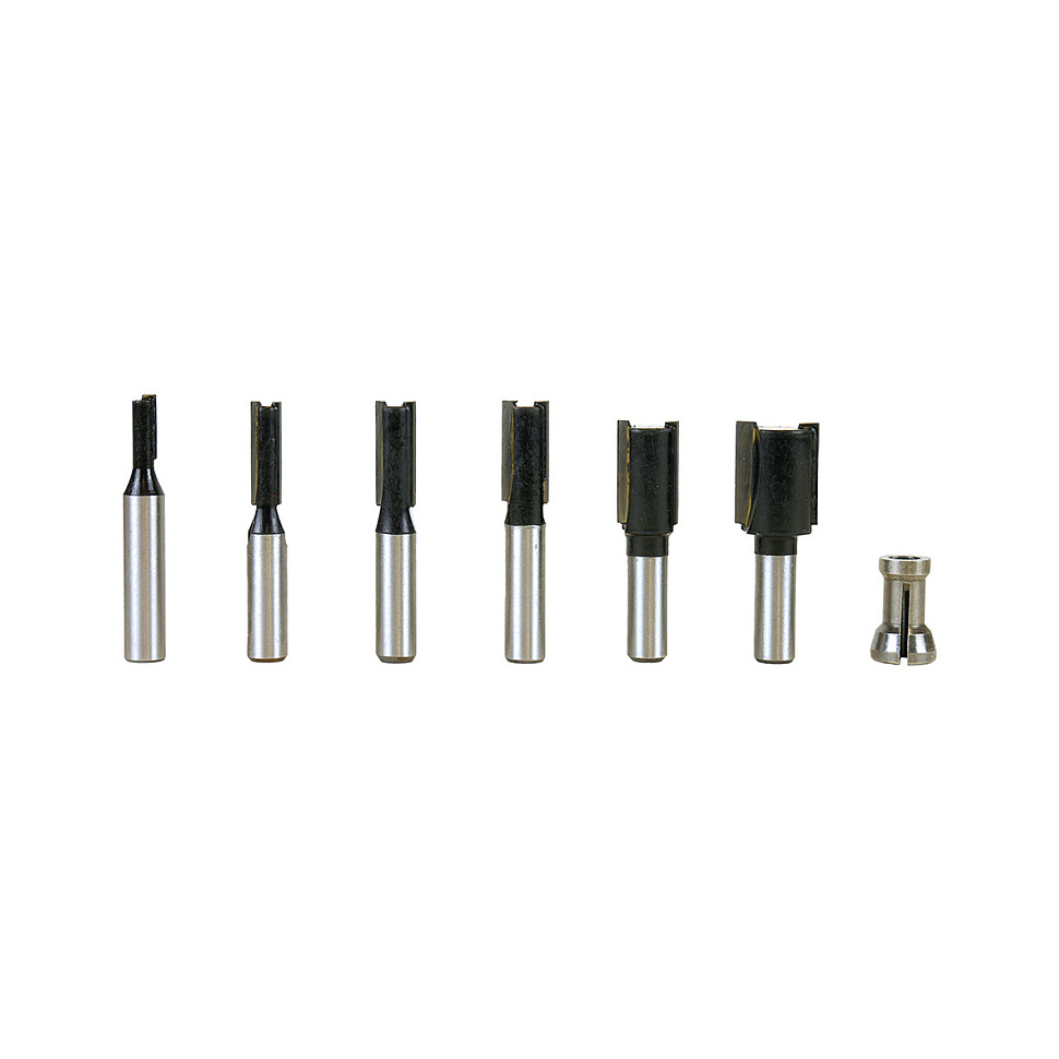 В набор входят 6 фрез, копировальная втулка для работы по шаблону, адаптер для подключения строительного пылесоса и параллельный упор для выполнения точных прямолинейных резов.