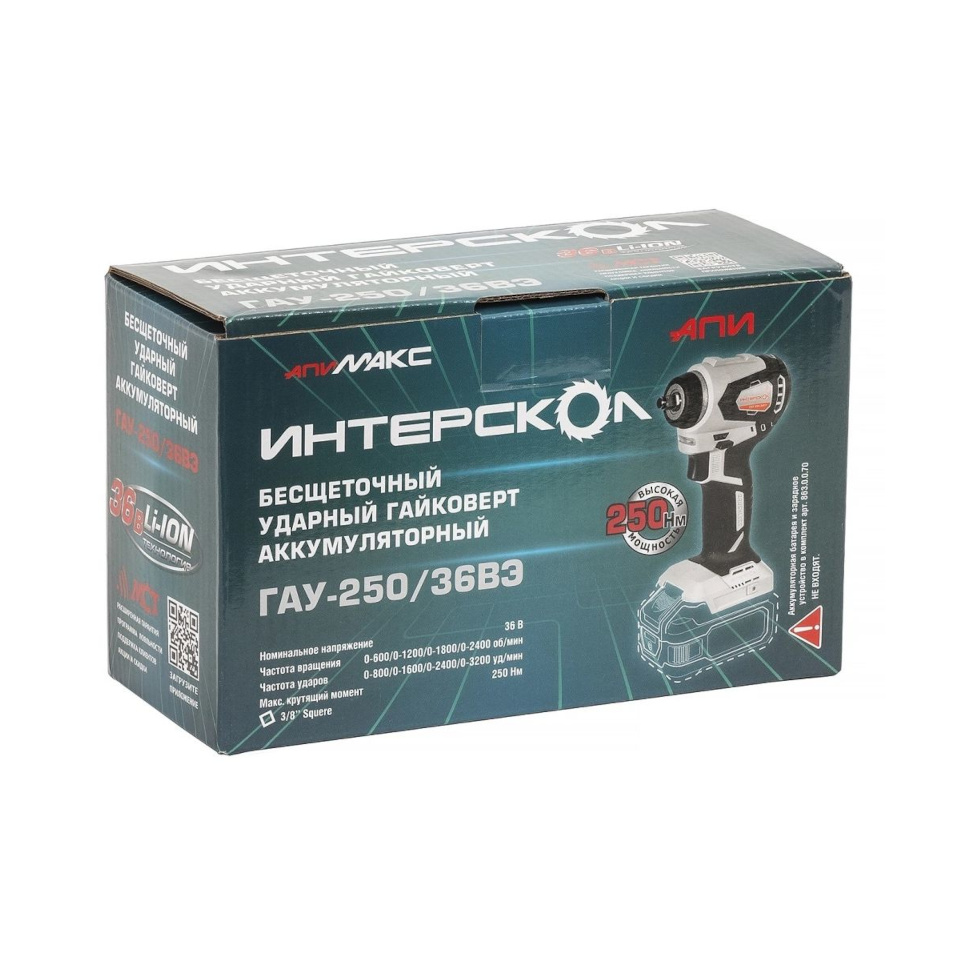 Гайковерт ударный аккумуляторный Интерскол ГАУ-250/36ВЭ АПИ б/щ 3/8" (863.0.0.70). Руководство по эксплуатации и инструкция по безопасности. Гарантийный талон. Коробка. |