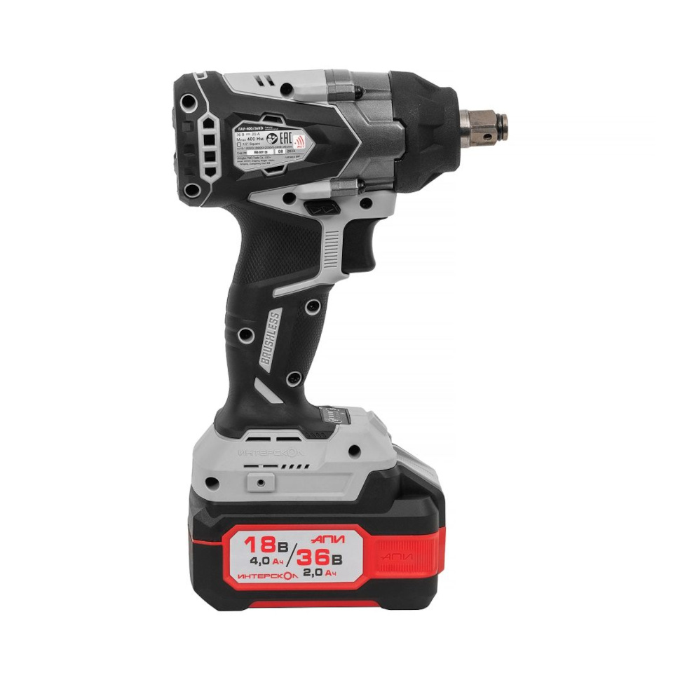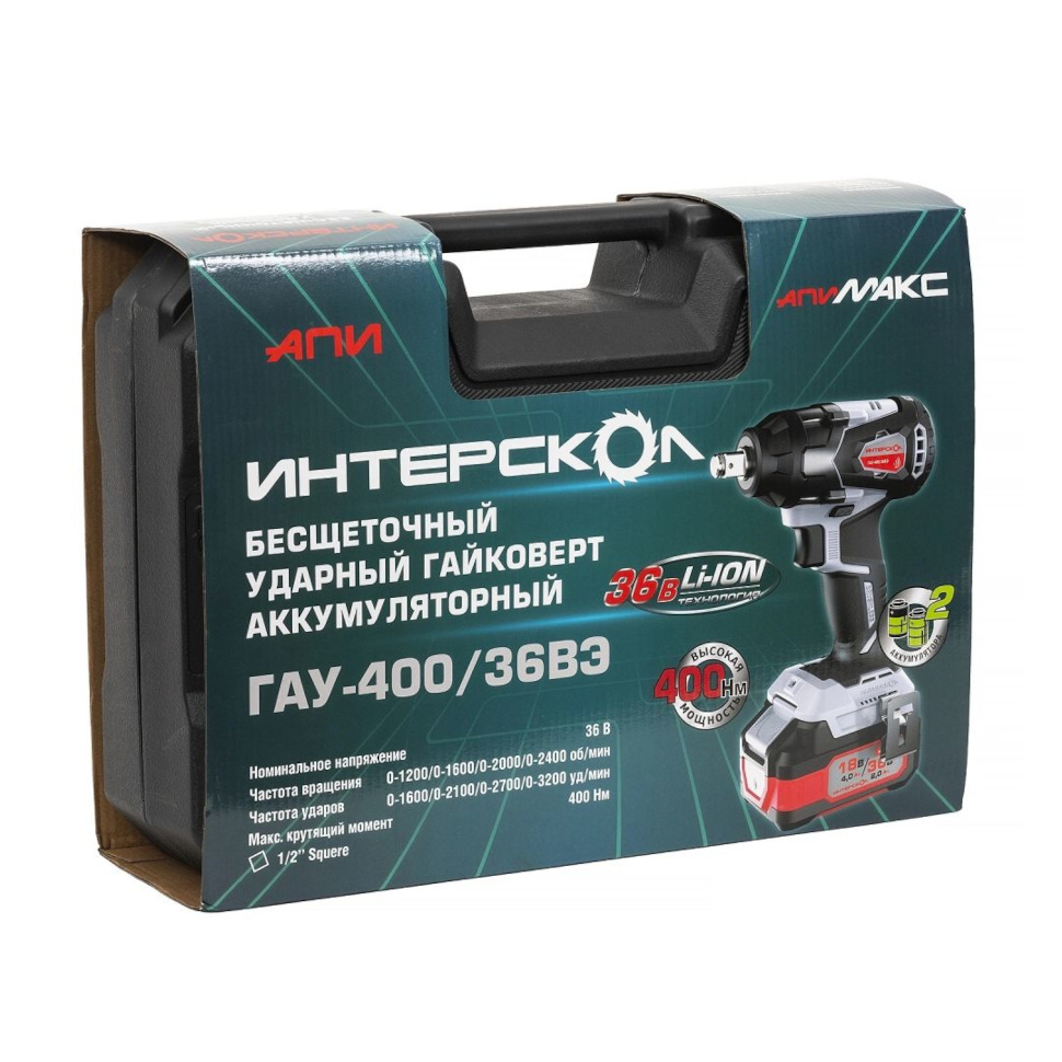 Характеристики Гайковерт ударный ИНТЕРСКОЛ ГАУ-400/36ВЭ АПИ квадрат 1/2" (кейс, 2 аккум. 2,0Ач) 859.2.2.70