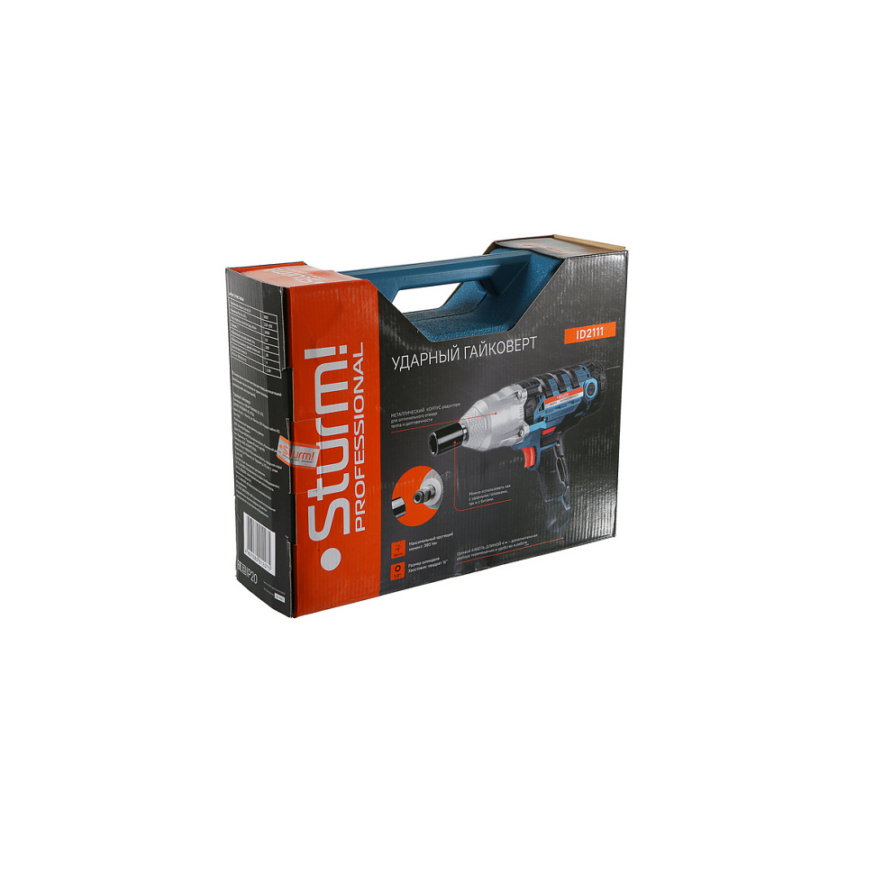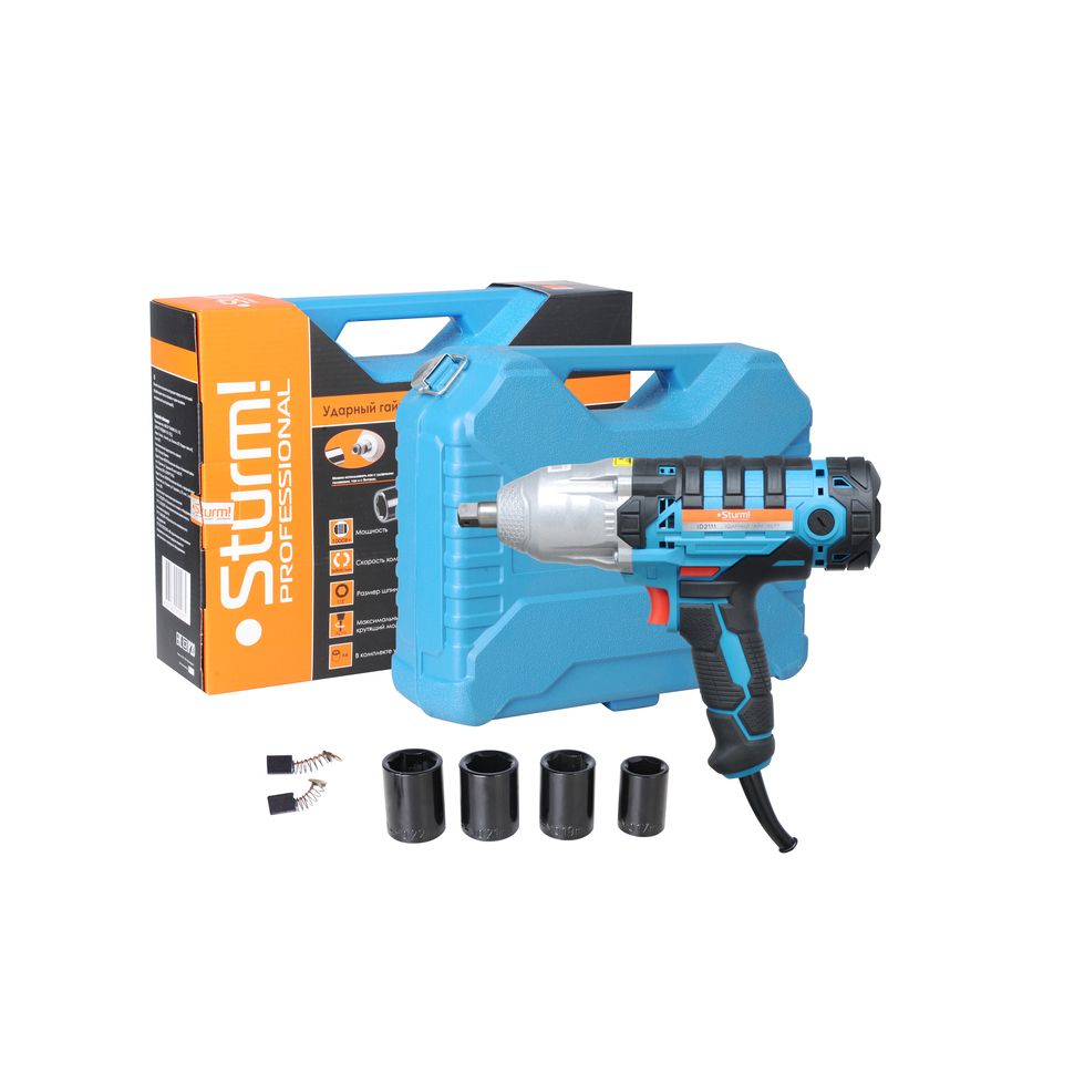 Гайковерт ударный Sturm ID2111. Насадки (4шт: 17,19,21,22мм). Дополнительные угольные щетки (комплект, 2шт). Инструкция по эксплуатации. Инструкция по безопасности. Кейс. |