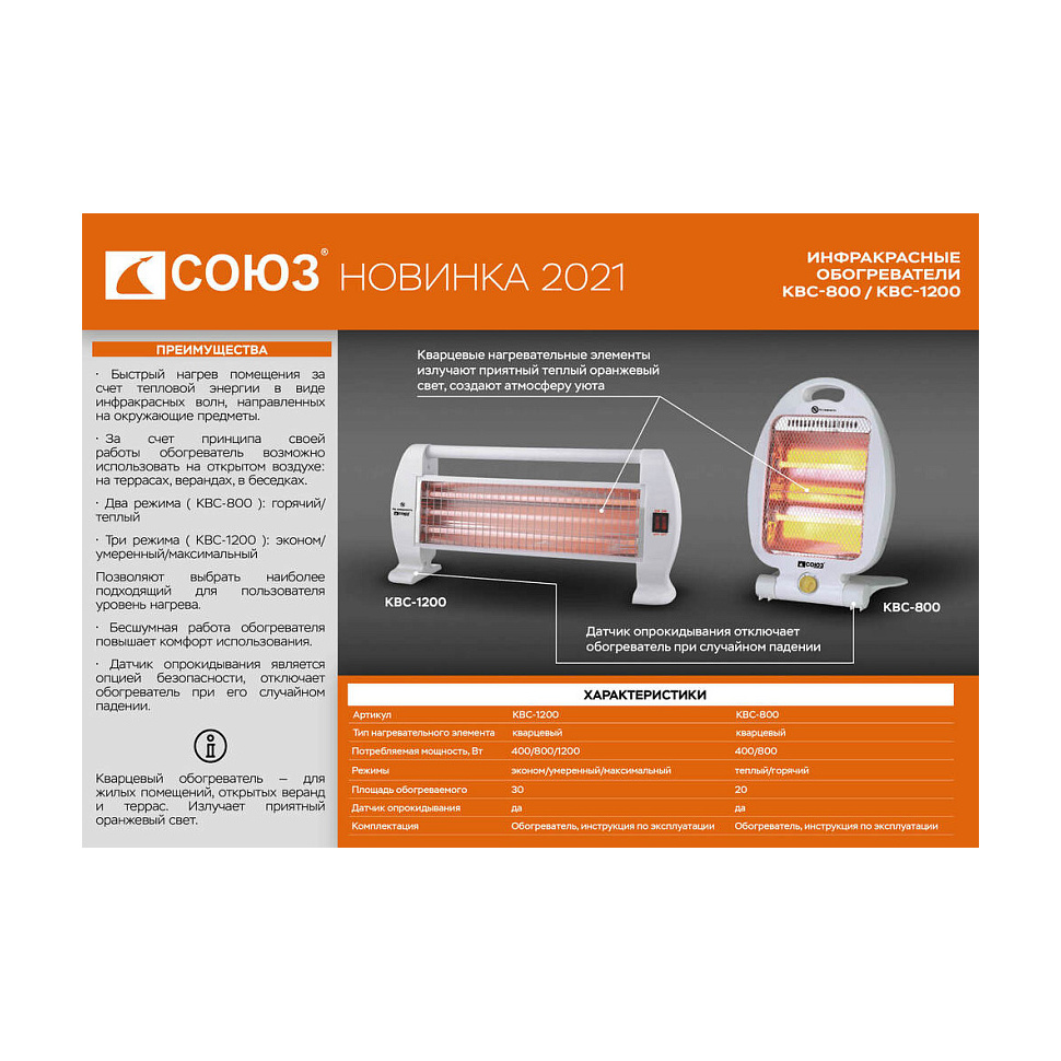Обогреватель кварцевый СОЮЗ КВС-800. Инструкция по эксплуатации. Инструкция по безопасности. Коробка. |