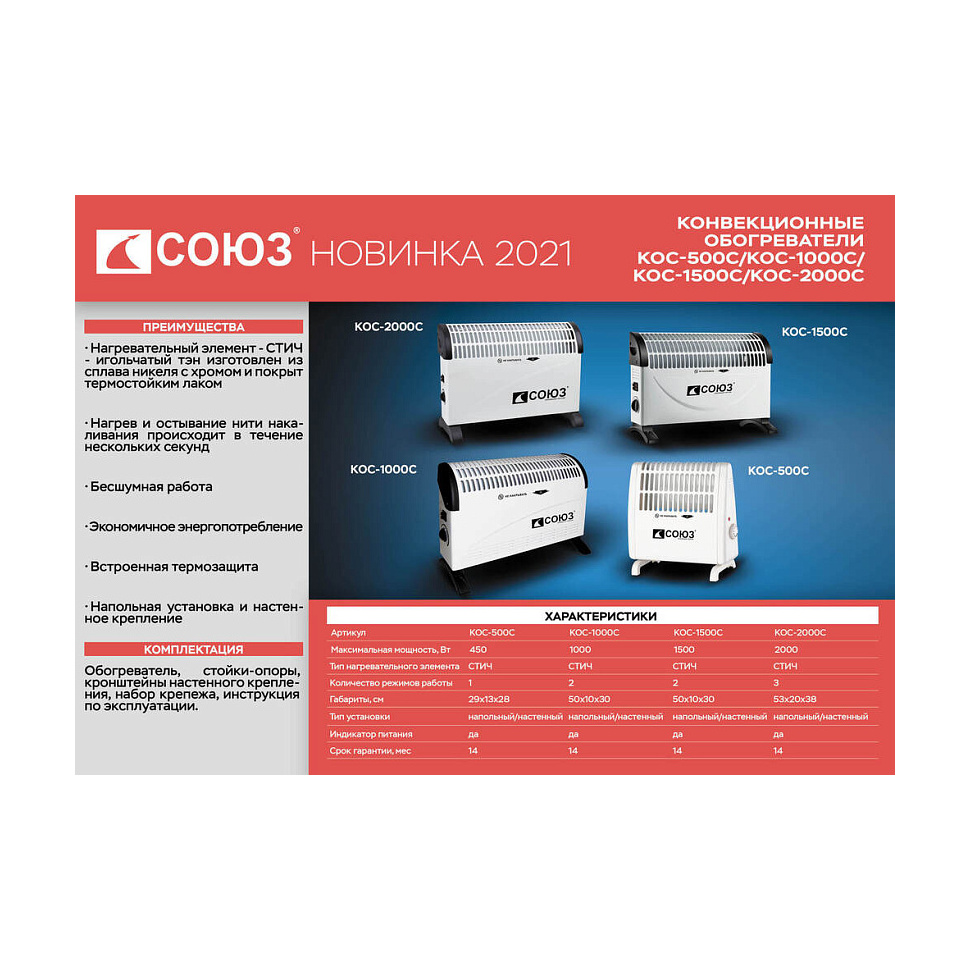 Конвекторный обогреватель Союз КОС-1000С обеспечивает эффективный обогрев с технологией СТИЧ, причём может быть установлен как на полу, так и на стене (все необходимое входит в комплект).
