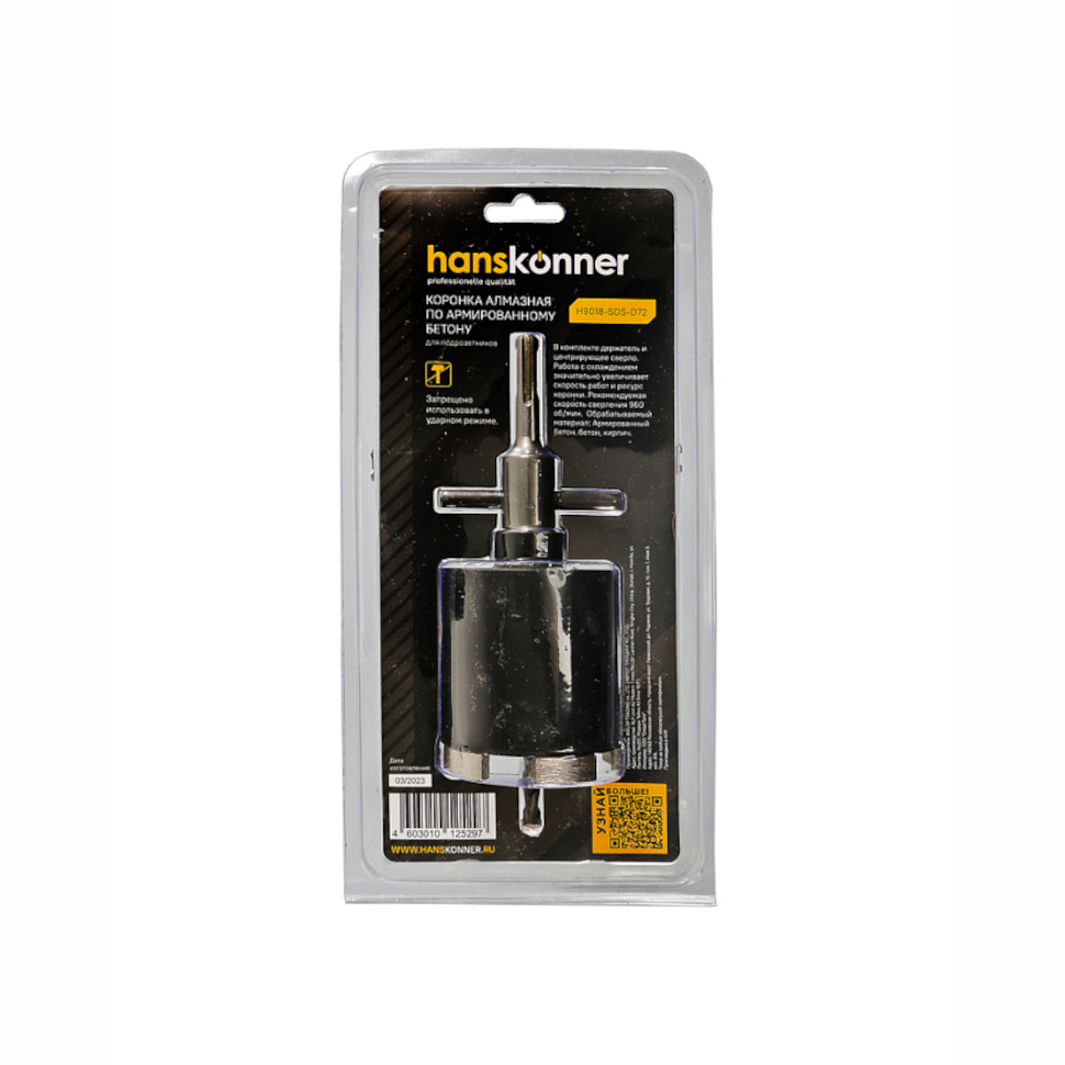 Алмазная коронка Хансконнер диаметром 72 мм с пятью сегментами демонстрирует высокую эффективность при работе с особо прочными материалами.