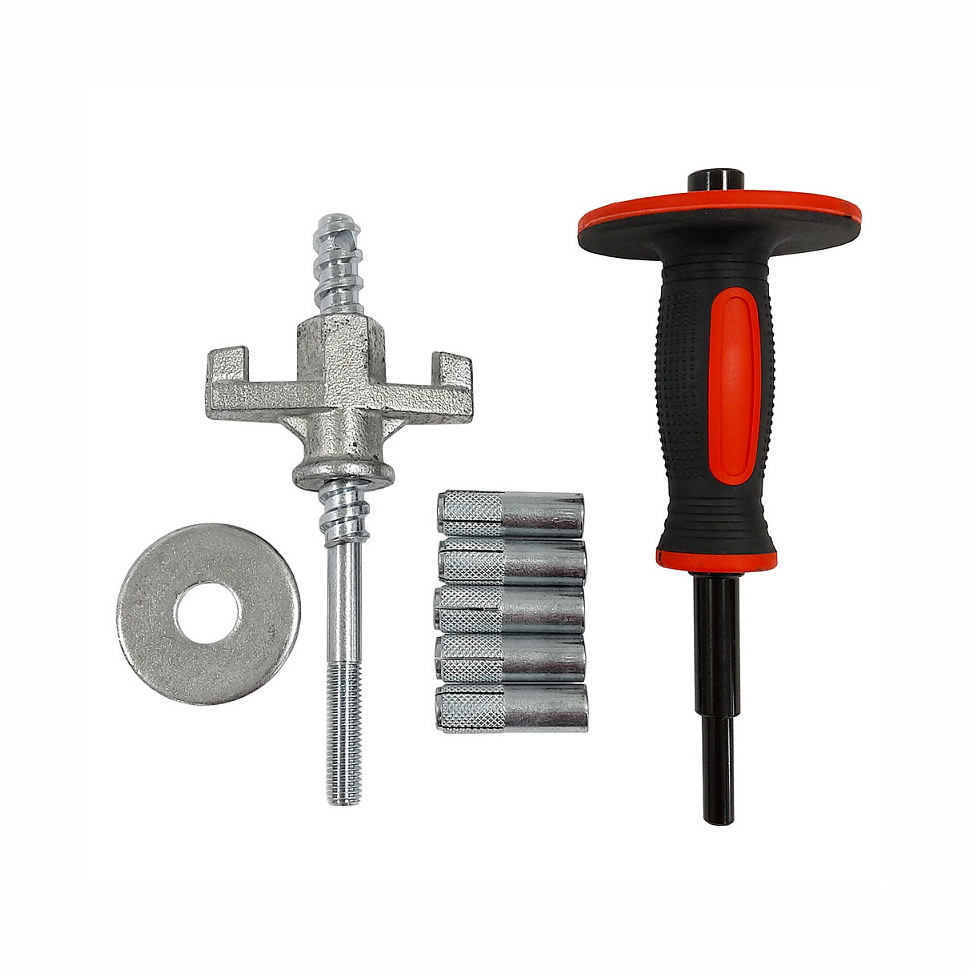 Шпилька 200 мм. Прижимная гайка. Шайба. Удобный пробойник для расклинивания анкеров. 5 анкеров (М12х50мм) для крепления в бетоне. Кейс. |