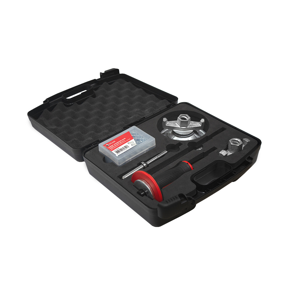 Анкер забивной 16x50 мм - 24шт. Шпилька (длина 200 мм). Самоцентрирующаяся прижимная гайка. Прижимная гайка. Шайба. Пробойник для расклинивания анкеров. Сверло победитовое 16мм. Кейс. |