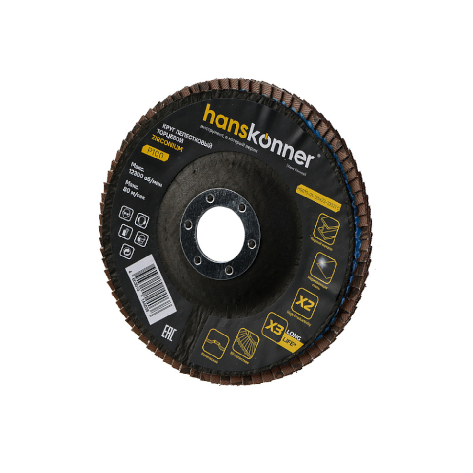 Характеристики Круг лепестковый по металлу 125х22.23 Р 100 конический, циркон. HANSKONNER (H9010-01-125x22-100ZTC)