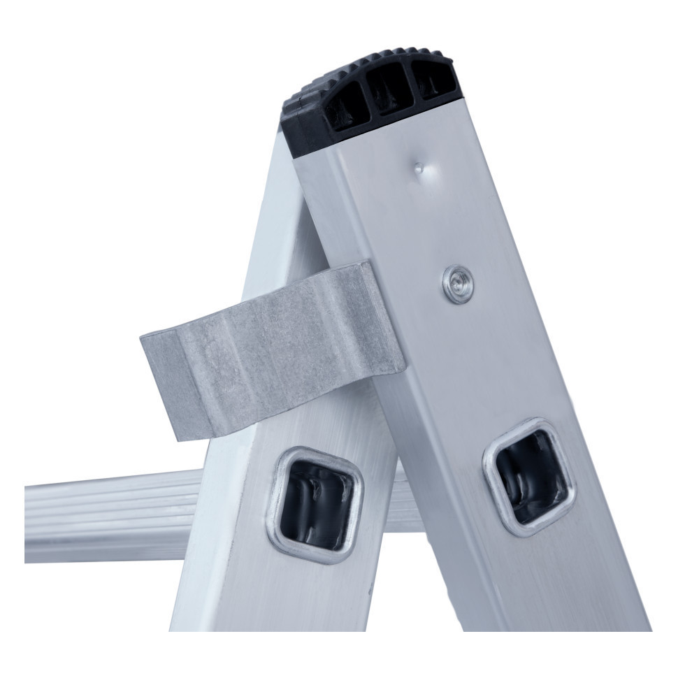 Удобство в работе с лестницей обеспечивают 2 зацепа и фиксатор секции на нужным шаге, который работает в автоматическом режиме.