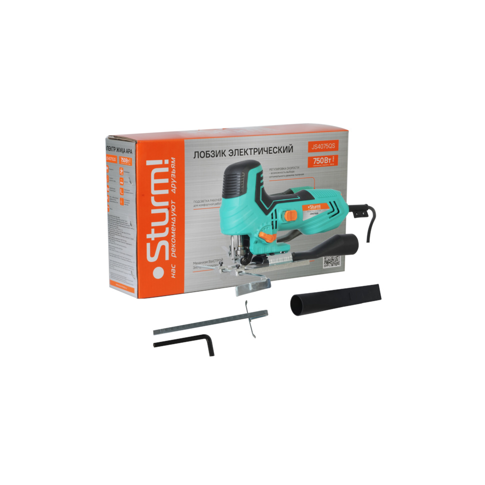 Лобзик Sturm JS4075QS. Параллельная направляющая. Ключ шестигранный. Пилка для лобзика. Адаптер для подключения пылесборника (установлен). Запасные угольные щетки (комплект, 2шт). Инструкция по эксплуатации. Инструкция по безопасности. Коробка. |