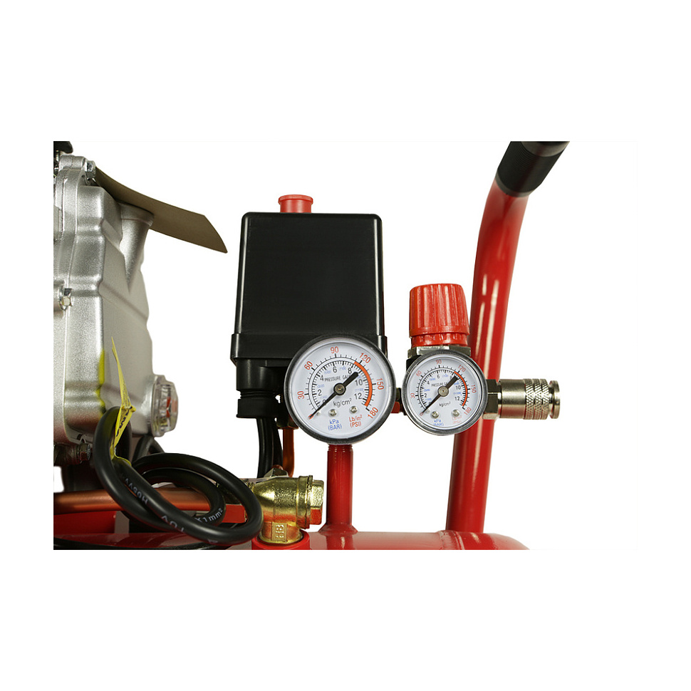 Конструкция с защитным кожухом обеспечивает эффективное охлаждение двигателя, а дренажный клапан ресивера позволяет своевременно удалять накопившийся конденсат.