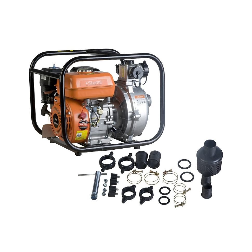 Мотопомпа Sturm BP8760VD. Фильтр. Штуцер 1,5" - 2шт. Прокладка 1.5" - 2шт. Гайка 1,5" - 2шт. Хомут 1,5" - 2шт. Штуцер 2" - 2шт. Прокладка 2" - 2шт. Гайка 2" - 2шт. Хомут 2" - 3шт. Гайка - 4шт. Резиновые ножки - 4шт. Свечной ключ. Рычаг свечного ключа. Коробка. |