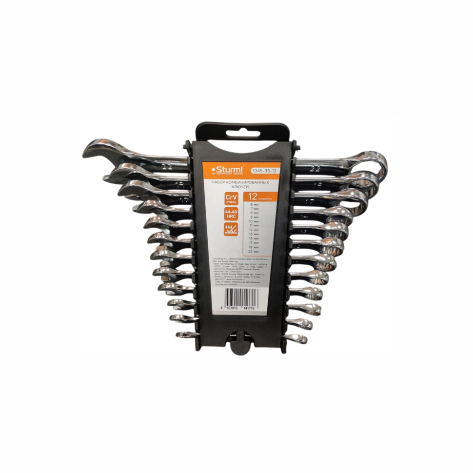 Набор комбинированных гаечных ключей Штурм (артикул 1045-36-12) включает 12 предметов размером 6, 7, 8, 9, 10, 11, 12, 13, 14, 17, 19, 22 мм.