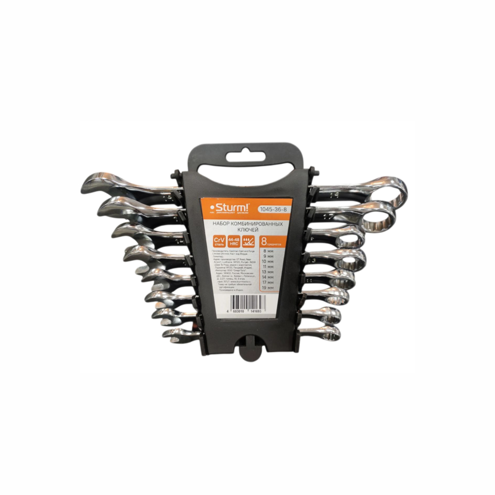 Набор комбинированных гаечных ключей Штурм (артикул 1045-36-8) включает 8 предметов размером 8, 9, 10, 11, 13, 14, 17 и 19 мм.