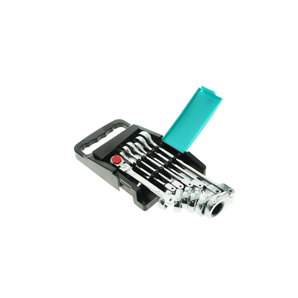 Набор комбинированных трещоточных шарнирных ключей Штурм из 7 предметов демонстрирует высокую универсальность благодаря шарнирному механизму и плотному шагу трещотки (72 зуба), позволяющим работать в труднодоступных местах под любым углом.