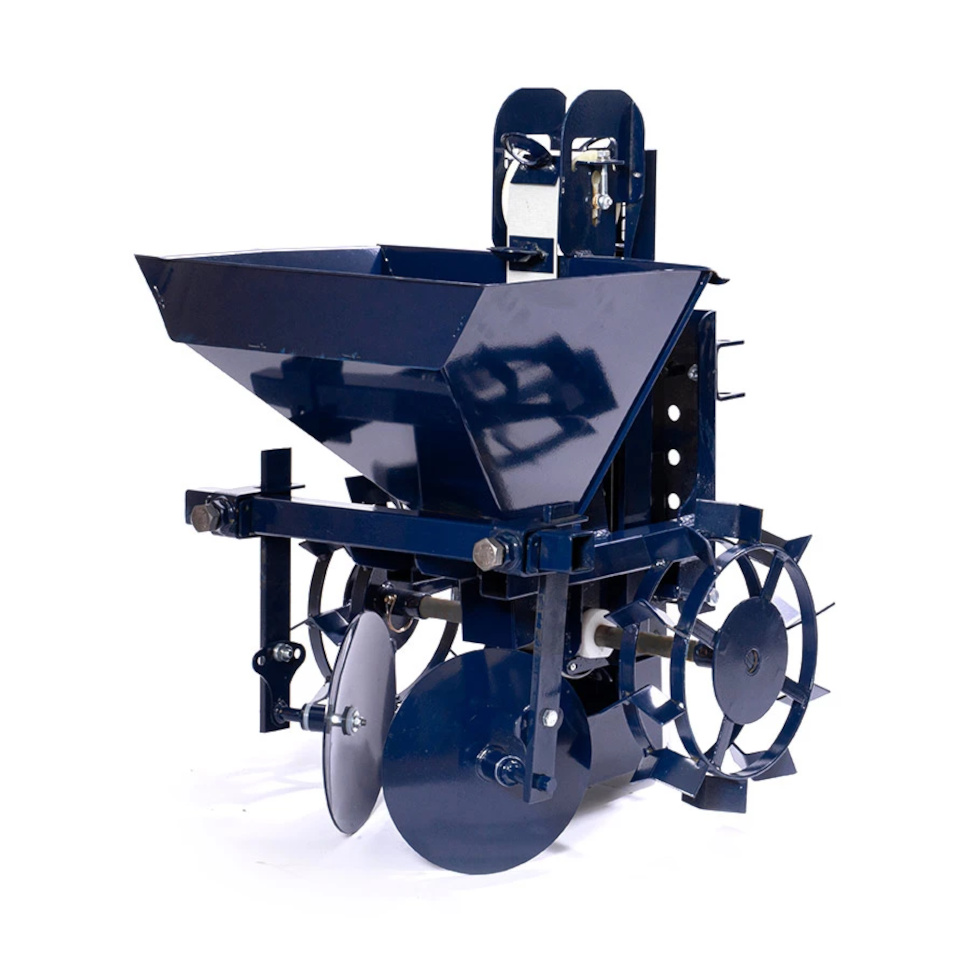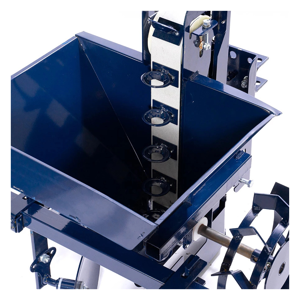 - Полная комплектация: В набор входят сварной корпус с бункером объемом 28 литров, рама транспортера, дисковые окучники, устройство регулировки заглубления бороздодела и грунтозацепы.