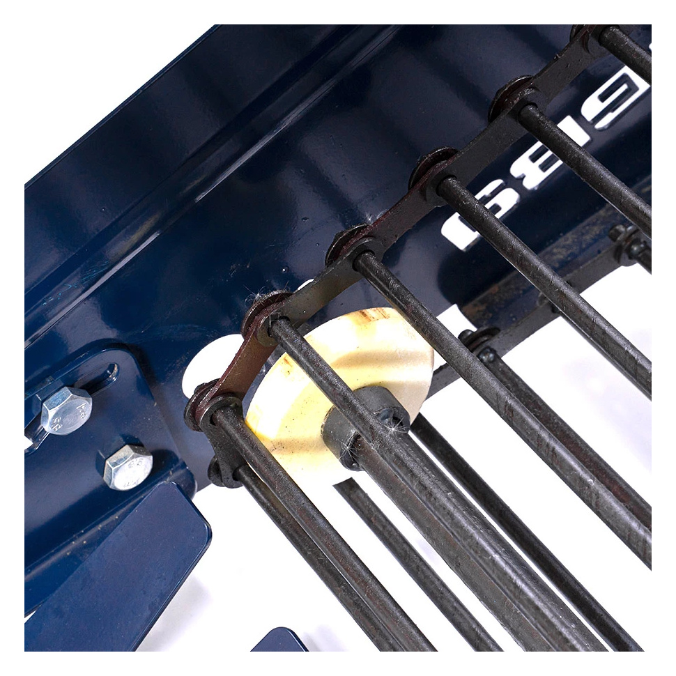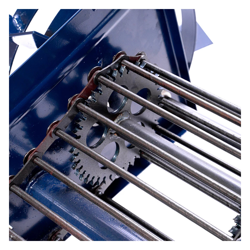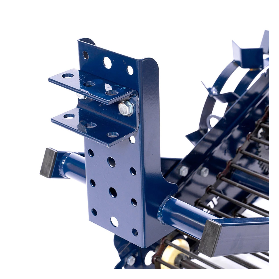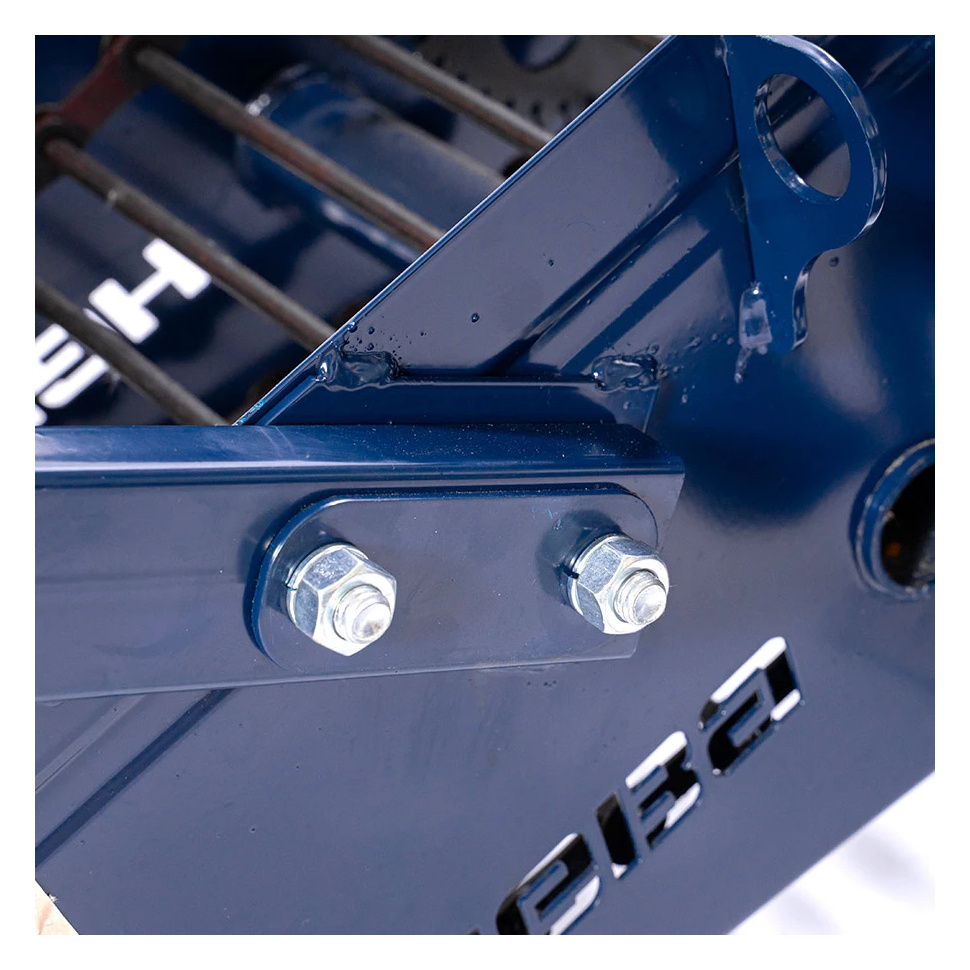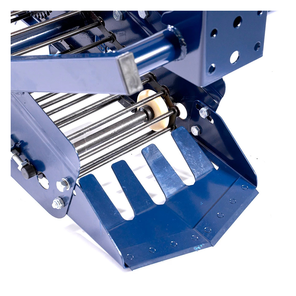- Картофелекопалка состоит из прочного корпуса, транспортерной ленты, ножа-рыхлителя, грунтозацепов, колесной оси и валов. В комплект входит специальная скоба для присоединения к мотоблоку.