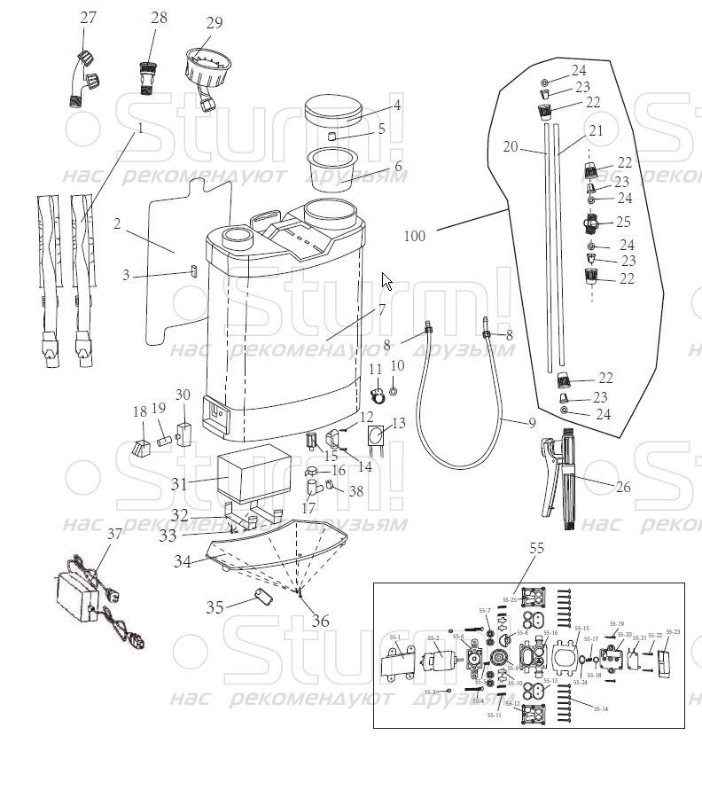 Опрыскиватель садовый аккумуляторный Sturm GS8216B. Зарядное устройство. Форсунки - 3шт. Уплотнительное кольцо - 4шт. Ручка регулировки расхода. Телескопическая трубка. Кронштейн для трубки. Инструкция по эксплуатации. Инструкция по безопасности. Коробка. |
