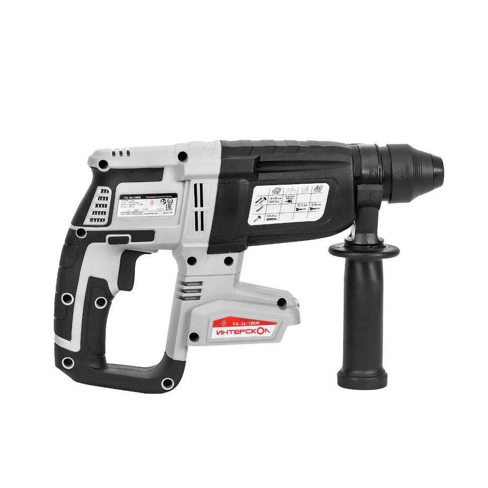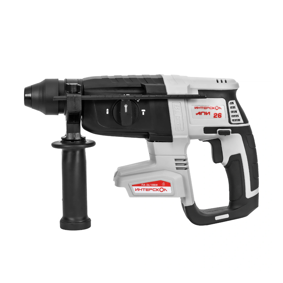 Профессиональный аккумуляторный бесщёточный перфоратор Интерскол ПА-26/18ВM, работая в трех режимах (сверление, сверление с ударом, долбление), идеально подходит для бурения отверстий, пробивания штроб и отбойных работ в бетоне, кирпиче и камне.