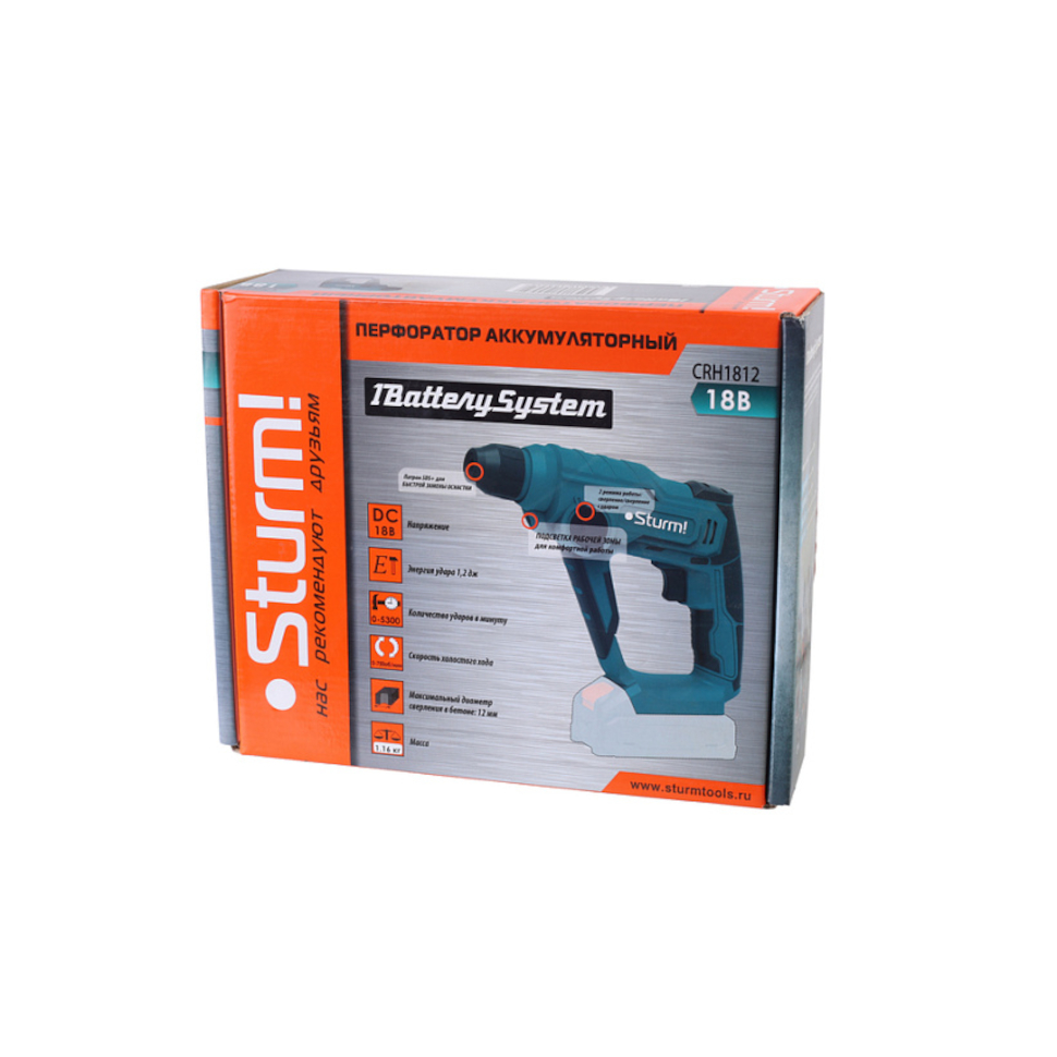 Характеристики Перфоратор аккумуляторный Sturm CRH1812 (1BatterySystem18V, без АКБ и ЗУ)