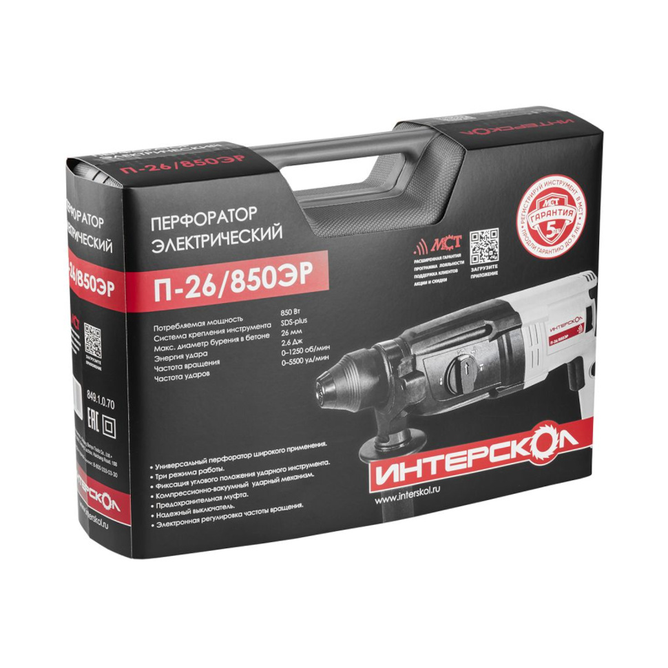 Преимущества Интерскол П-26/850ЭР (849.1.0.70):Трехрежимный перфоратор Интерскол П-26/850ЭР - это оптимальный выбор для бытового и профессионального использования, где требуются мощность, универсальность и проверенная надежность.