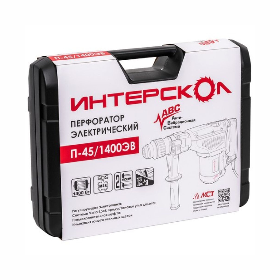 Перфоратор Интерскол П-45/1400ЭВ (828.1.0.70). Рукоятка боковая. Смазка для буров. Руководство по эксплуатации и Инструкция по безопасности. Гарантийный талон. Кейс пластиковый. |