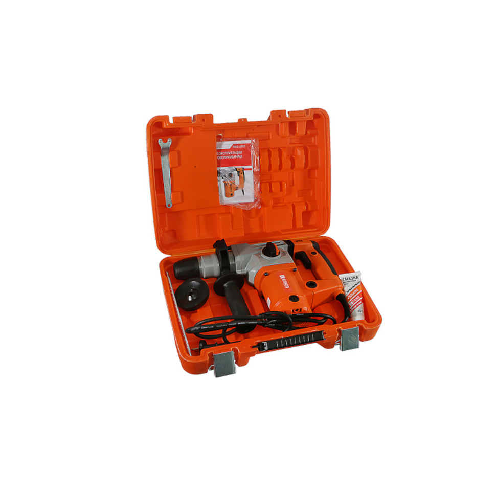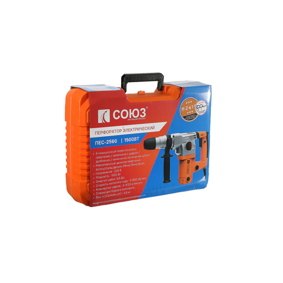 Перфоратор Союз ПЕС-2560. Вспомогательная рукоятка. Ограничитель глубины сверления. Пылезащитный колпачок. Смазка для хвостовиков буров. Ключ. Инструкция по эксплуатации. Инструкция по безопасности. Кейс. |