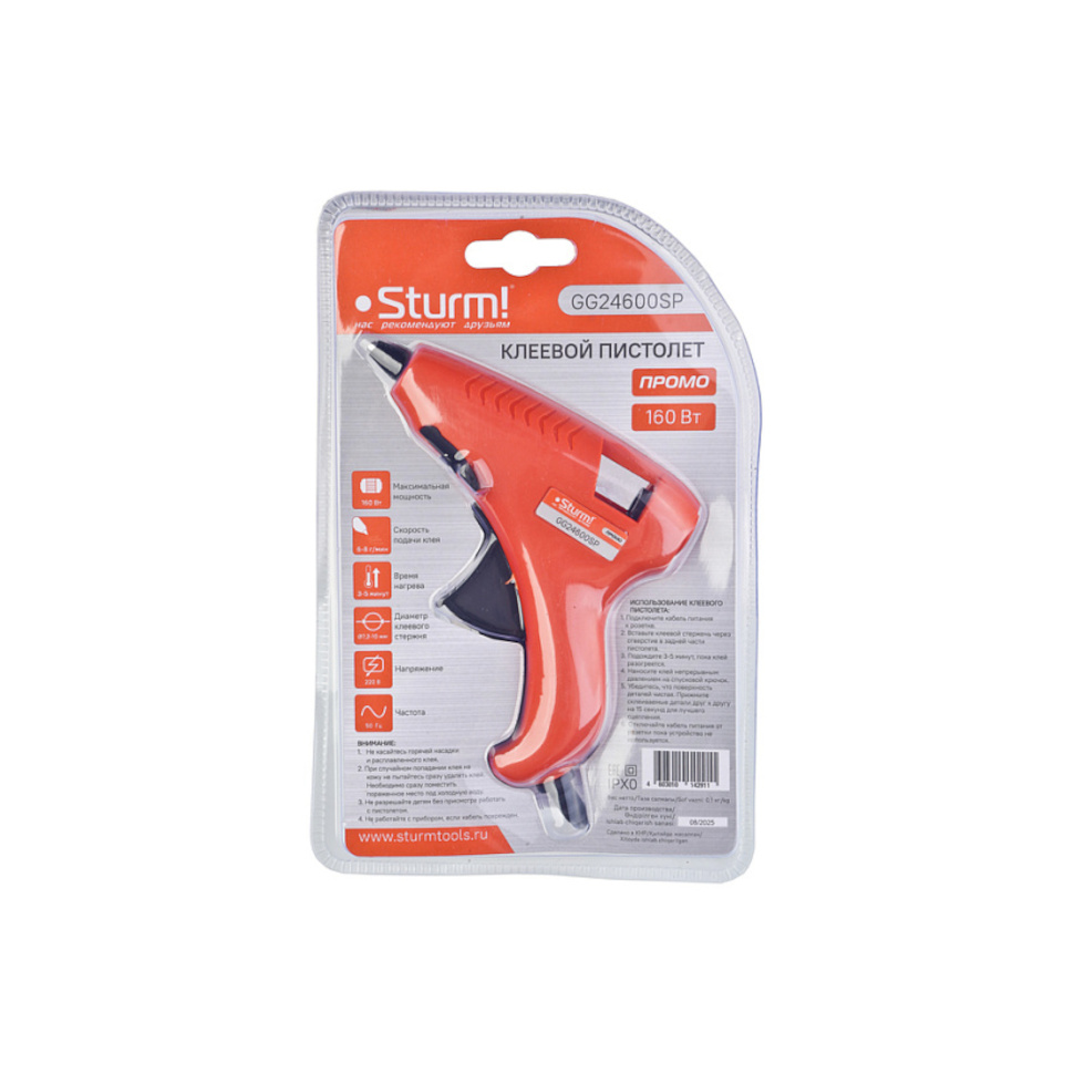 Характеристики Пистолет клеевой Sturm GG24600SP (160Вт, 7мм, 8 г/мин, 2 стержня, блистер)