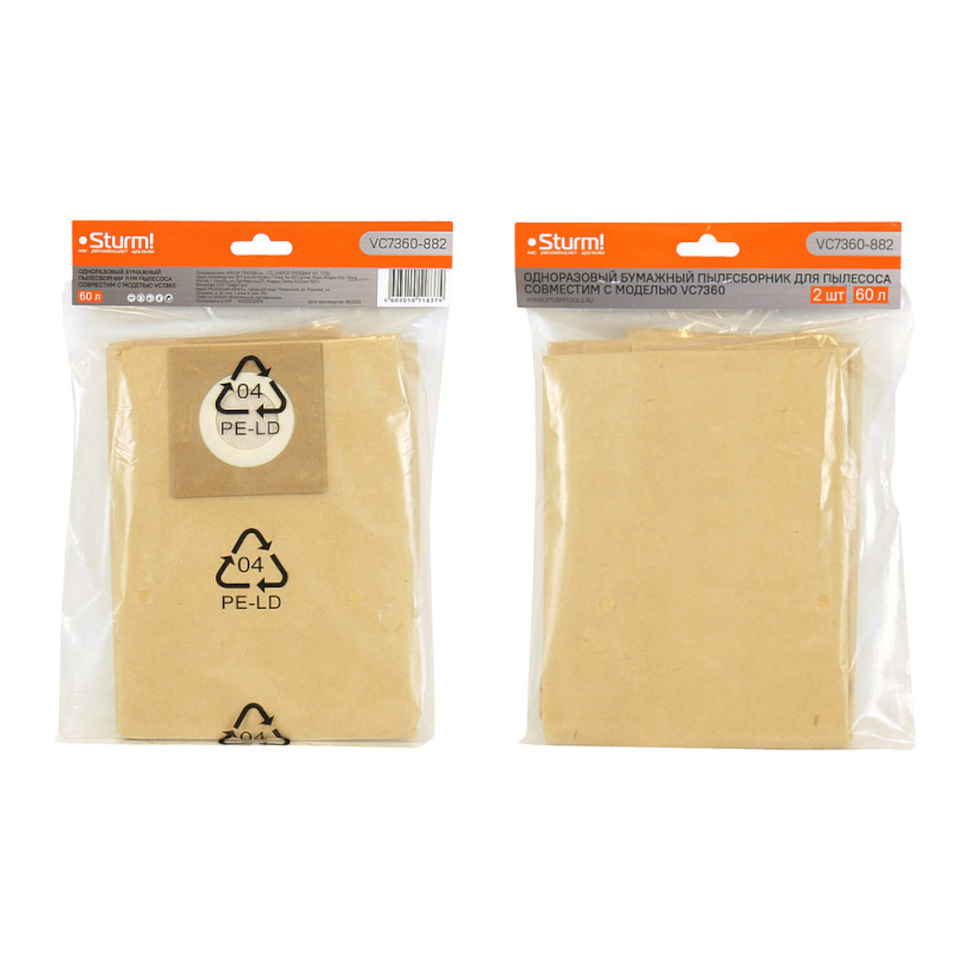 Характеристики Мешок для пылесоса 60л, бумажный, 2шт/уп STURM (VC7360-882)