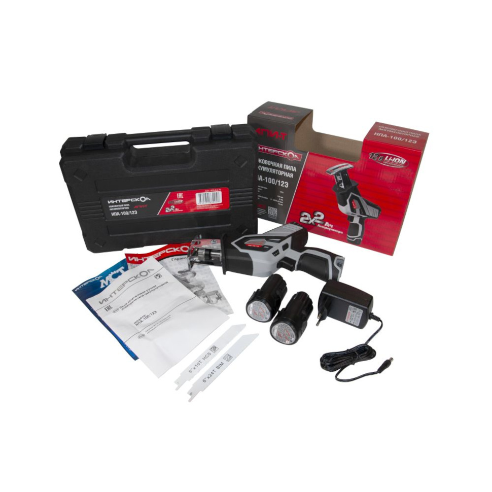 Ножовочная аккумуляторная пила Интерскол НПА-100/12Э АПИ-Т (805.2.2.70). Аккумулятор 2 А/ч - 2шт. Зарядное устройство. Полотно ножовочное по дереву. Полотно ножовочное по металлу. Руководство по эксплуатации. Кейс. |