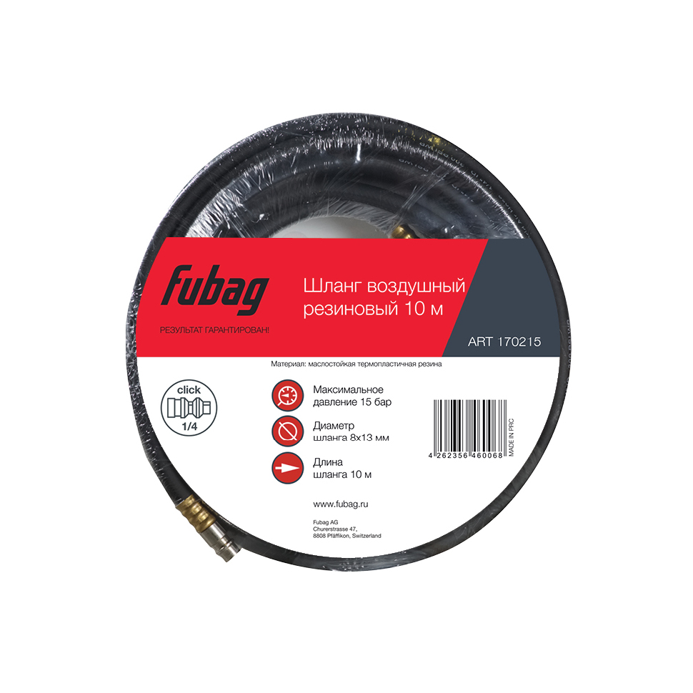 Характеристики Шланг для компрессора 10м FUBAG 170215 (15 бар, 8х13мм, с фитингами рапид, маслостойкая резина)
