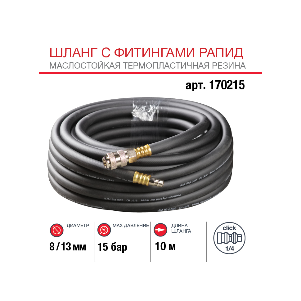 Маслостойкий шланг Фубаг 170215 благодаря комплектации фитингами рапид обеспечивает мгновенное подключение к инструменту без дополнительных аксессуаров.